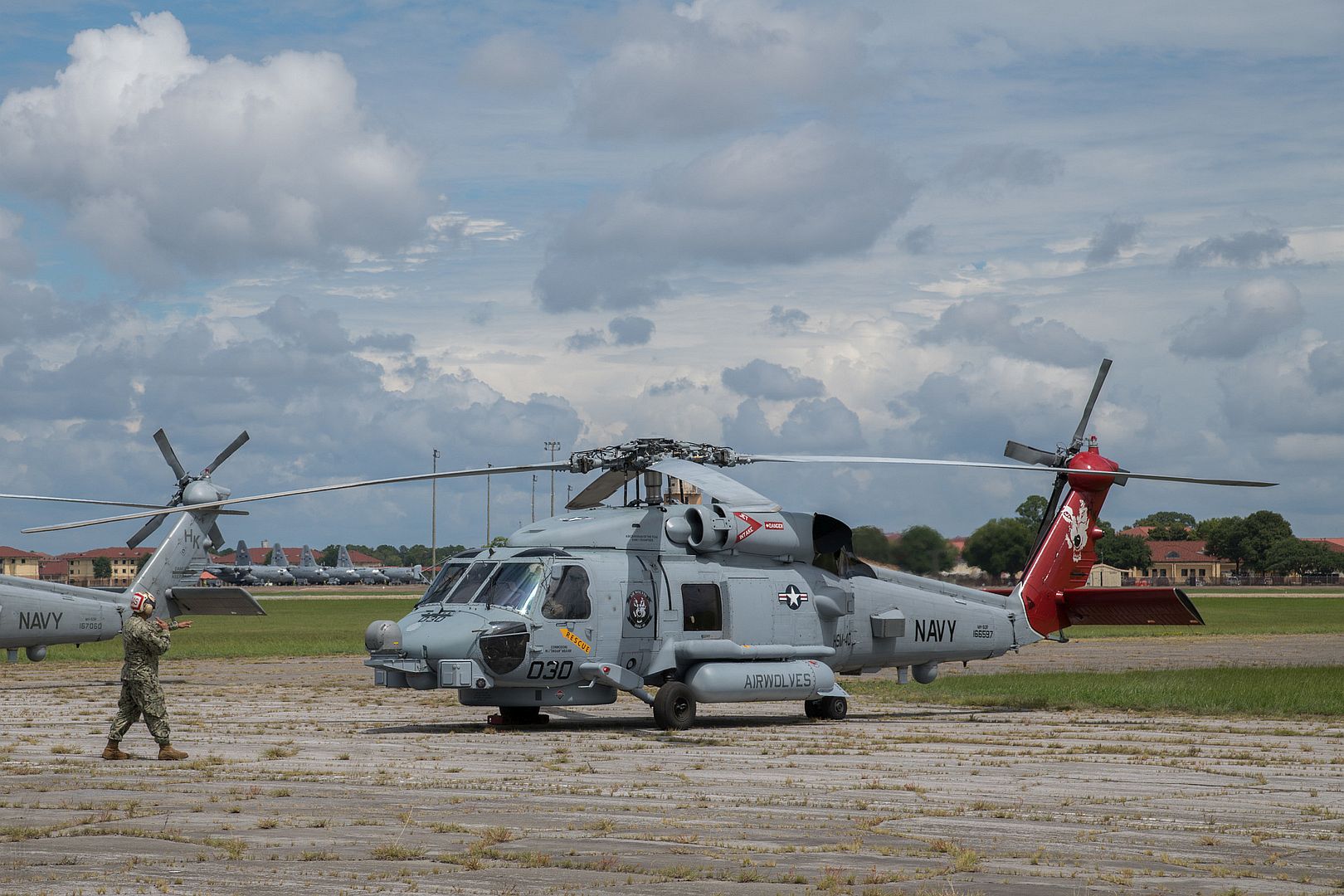 A sailor directs a U.S. Navy MH-60R Sea Hawk helicopter after arriving at Maxwell Air Force Base, Alabama, from Naval Air Station Jacksonville and Naval Station Mayport, Florida, Sept. 1, 2019. The helicopters evacuated from the Jacksonville area in advance of Hurricane Dorian. In addition to the helicopters, Maxwell AFB is serving as an Incident Support Base for Federal Emergency Management Agency and Defense Logistics Agency personnel and equipment. (U.S. Air Force photo by Billy Birchfield)