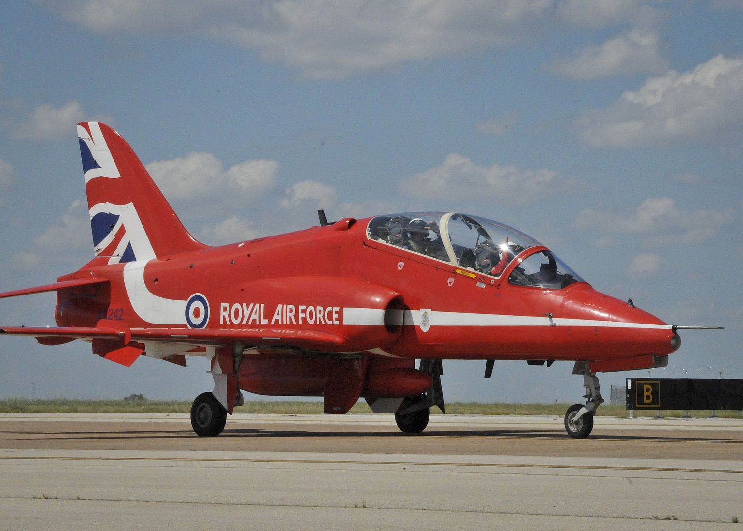 FORT WORTH, Texas (Sept. 9, 2019) An aircraft assigned to the Royal Air Force Red Arrow taxi on the airfield at Naval Air Station Fort Worth Joint Reserve Base, Texas, after landing Sept. 9. The Red Arrows will stay in Fort Worth for a few days as they participate in a series of different ceremonies and special events in the Dallas-Fort Worth area and Houston. U.S. Navy photo by Jacquelyn D. Childs/Released.
