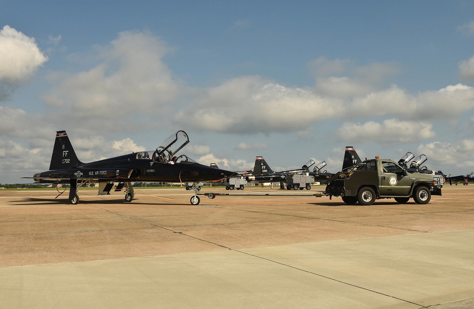 U.S. Air Force Airmen prepare a T-38 Talon for takeoff at Joint Base Langley-Eustis, Virginia, September 3, 2019. The T-38 was being moved to Rickenbacker Air National Guard Base, Ohio during evacuations for Hurricane Dorian. (U.S. Air Force photo by Airman 1st Class Sarah Dowe)