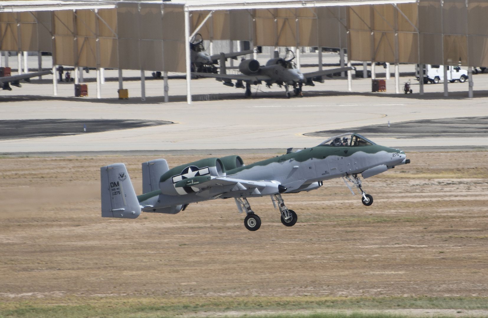 A recently painted A-10 Thunderbolt II assigned to the A-10 Demonstration Team flies over Davis-Monthan Air Force Base, Arizona, Sept. 23, 2019. 355th Equipment Maintenance Squadron Airmen repainted the A-10 to resemble the P-51 Mustang from the World War II era. (U.S. Air Force photo's by Senior Airman Cheyenne A. Powers)
