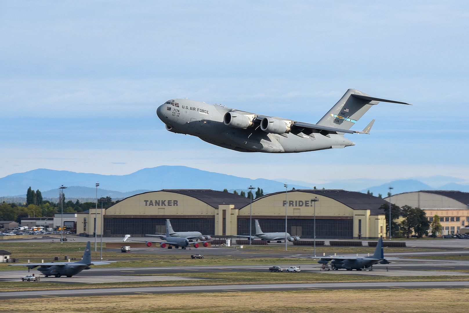A C-17 Globemaster III from Dover Air Force Base, Delaware takes off during Exercise Mobility Guardian 2019 at Fairchild Air Force Base, Washington, Sept. 27, 2019. Exercise Mobility Guardian is Air Mobility Command?s premier, large scale mobility exercise. Through robust and relevant training, Mobility Guardian improves the readiness and capabilities of Mobility Airmen to deliver rapid global mobility and builds a more lethal and ready Air Force. (U.S. Air Force photo by 1st Lt Jessica Cicchetto)