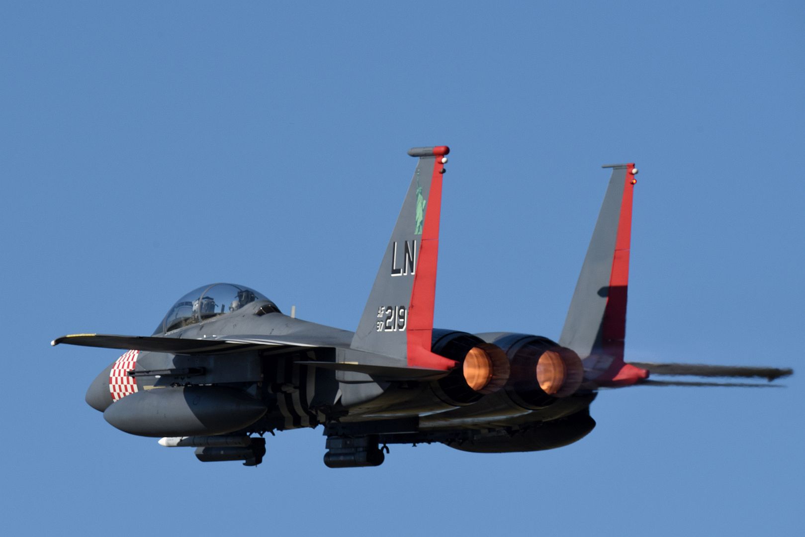 An F-15E Strike Eagle, assigned to the 492nd Fighter Squadron launches in support of an inter-fighter squadron ?Turkey Shoot? competition at Royal Air Force Lakenheath, England, Sept. 26, 2019. The Turkey Shoot is an operational competition that tests the preparation and performance of fighter pilots, intelligence professionals, aircraft maintainers and air battle managers. (U.S. Air Force photo by Airman 1st Class Rhonda Smith)
