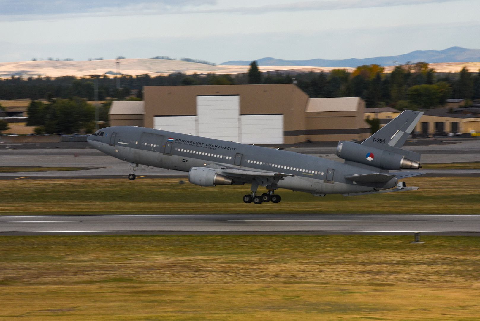 A Royal Netherlands Air Force KDC-10 takes off during Exercise Mobility Guardian 2019 at Fairchild Air Force Base, Washington, Sept. 27, 2019. Exercise Mobility Guardian is Air Mobility Command?s premier, large scale mobility exercise. Through robust and relevant training, Mobility Guardian improves the readiness and capabilities of Mobility Airmen to deliver rapid global mobility and builds a more lethal and ready Air Force. (U.S. Air Force photo by 1st Lt Jessica Cicchetto)