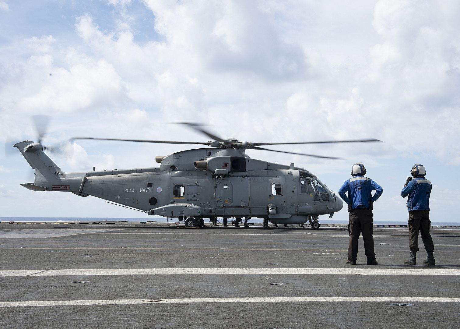 ATLANTIC OCEAN (Sept. 27, 2019) A Merlin HM Mk 2, attached to the Royal Navy aircraft carrier HMS Queen Elizabeth (R08), lands on the flight deck aboard the aircraft carrier USS Dwight D. Eisenhower (CVN 69). Commodore Mike Utley, OBE Royal Navy, Queen Elizabeth Carrier Strike Group, and Capt. Steve Moorhouse, OBE Royal Navy, HMS Queen Elizabeth, visited Ike Sept. 27. Ike, with embarked Carrier Air Wing 3, is underway conducting the Tailored Ship's Training Availability (TSTA) and Final Evaluation Problem (FEP) as part of the basic phase of the Optimized Fleet Response Plan. (U.S. Navy photo by Mass Communication Specialist 3rd Class Kaleb J. Sarten)