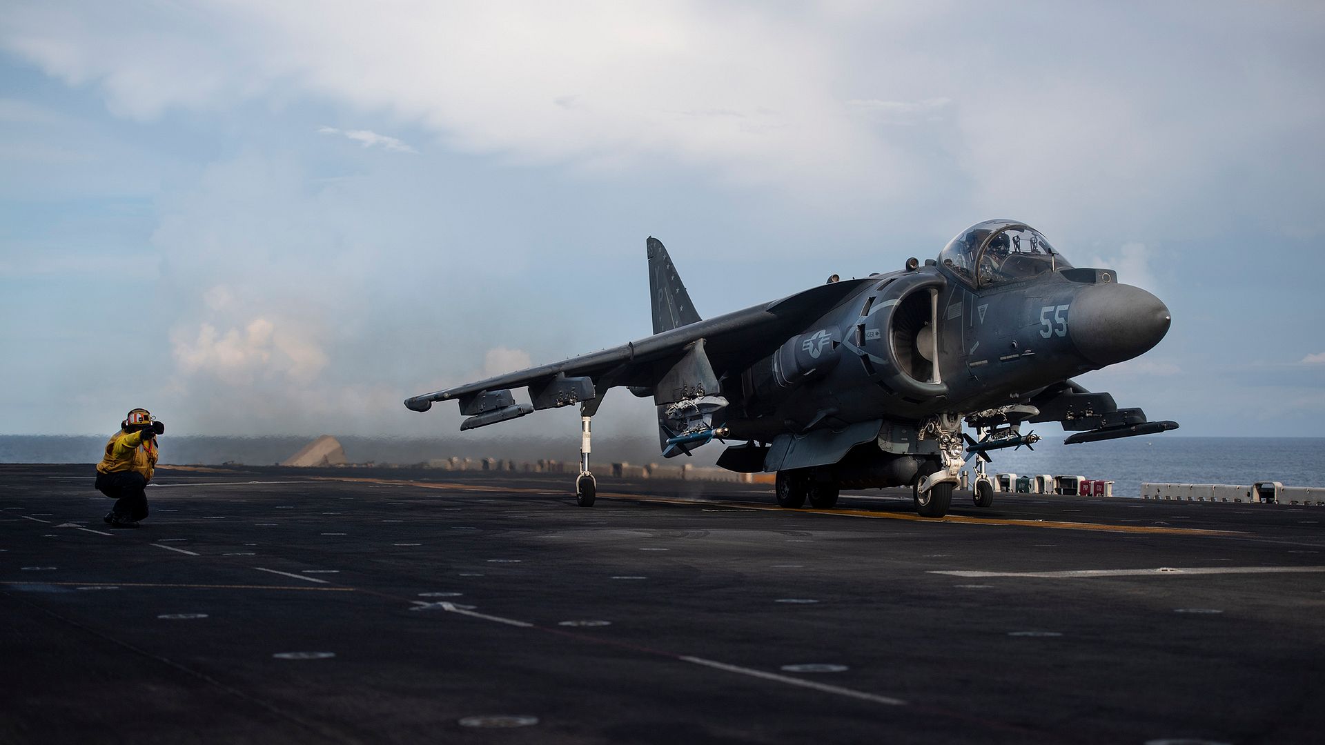 SOUTH CHINA SEA (Oct. 4, 2019) An AV-8B Harrier II, attached to Marine Medium Tiltrotor Squadron (VMM) 163 (Reinforced), takes off from the flight deck of the amphibious assault ship USS Boxer (LHD 4) during Tiger Strike 2019. Malaysian Armed Forces were joined by U.S. Marines and Sailors for exercise Tiger Strike 2019 where both forces participated in jungle survival, amphibious assault, aerial raids, combat service support training and cultural exchanges. The Boxer Amphibious Ready Group (ARG) and 11th Marine Expeditionary Unit (MEU) are deployed to the U.S. 7th Fleet area of operations to support regional stability, reassure partners and allies and maintain a presence to respond to any crisis ranging from humanitarian assistance to contingency operations. (U.S. Navy photo by Mass Communication Specialist 3rd Class Alexander C. Kubitza/Released)
