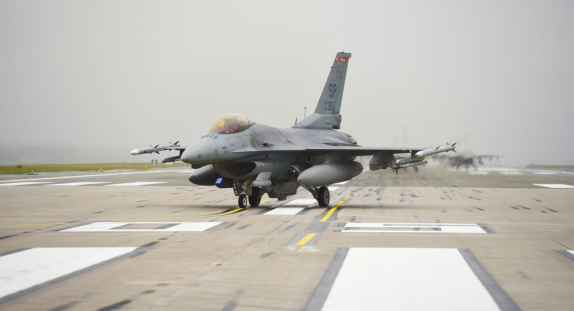 A U.S. Air Force F-16 Fighting Falcon exits the runway after a Show of Forces display at Spangdahlem Air Base, Germany, Oct. 1, 2019. The Show of Forces was a training event to test the response capabilities of the 52nd Fighter Wing. (U.S. Air Force photo by Staff Sgt. Joshua R. M. Dewberry)