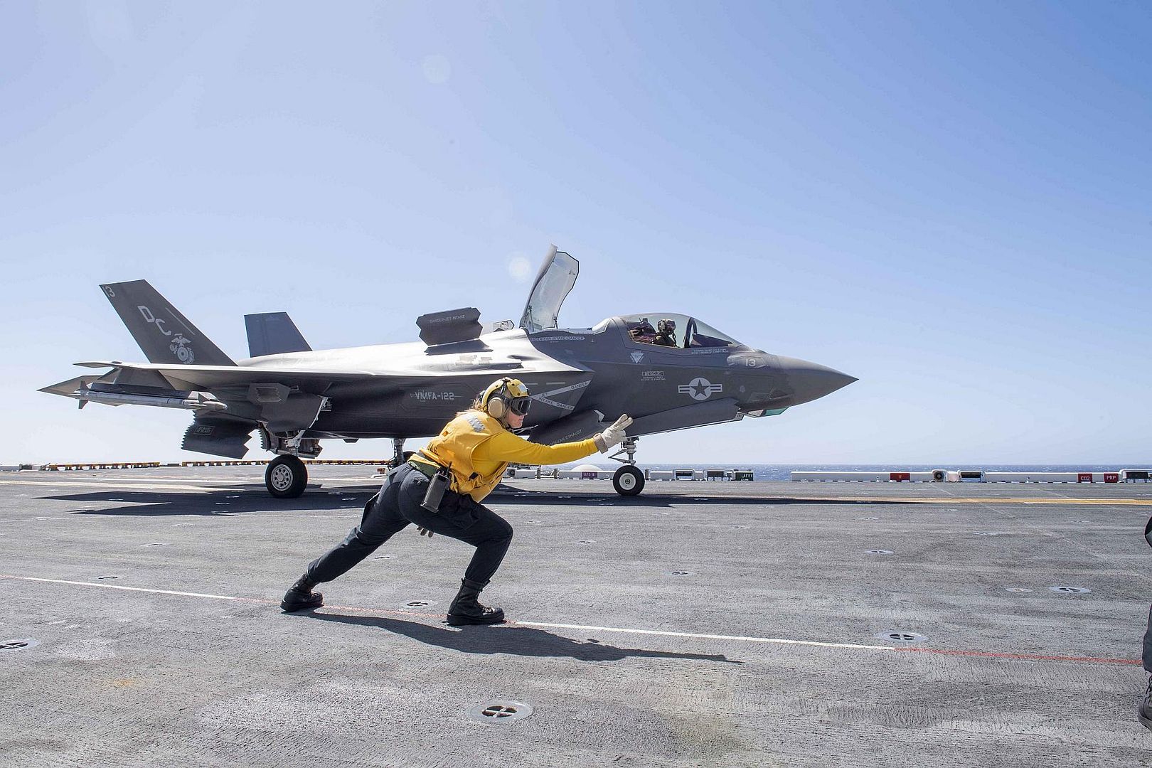 PACIFIC OCEAN (Oct. 2, 2019) Marines assigned to the "Flying Leathernecks" of Marine Fighter Squadron (VMFA) 122 perform maintenance on an F-35B Lightning II on the flight deck of the amphibious assault ship USS America (LHA 6). America is underway conducting routine operations. (U.S. Navy photo by Mass Communication Specialist 3rd Class Walter Estrada/Released)