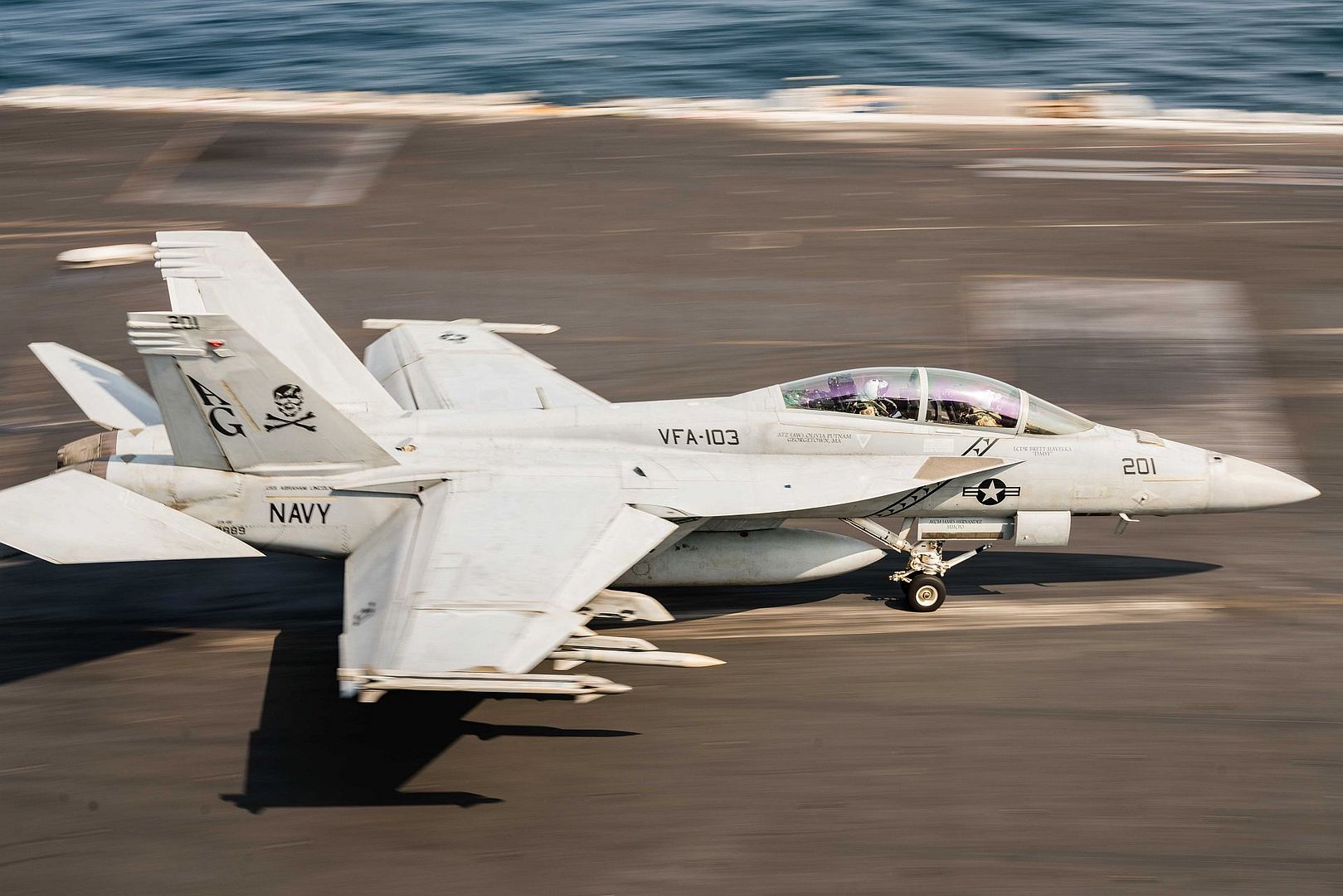 ARABIAN SEA (Oct. 3, 2019) An F/A-18F Super Hornet attached to the "Jolly Rogers" of Strike Fighter Squadron (VFA) 103 makes an arrested landing on the flight deck of the aircraft carrier USS Abraham Lincoln (CVN 72). Abraham Lincoln Carrier Strike Group is deployed to the U.S. 5th Fleet area of operations in support of naval operations to ensure maritime stability and security in the Central Region, connecting the Mediterranean Sea and the Pacific Ocean through the western Indian Ocean and three strategic choke points. With Abraham Lincoln as the flagship, deployed strike group assets include staffs, ships and aircraft of Carrier Strike Group (CSG) 12, Destroyer Squadron (DESRON) 2, the guided-missile cruiser USS Leyte Gulf (CG 55) and Carrier Air Wing (CVW) 7. (U.S. Navy photo by Mass Communication Specialist Seaman Mohamed Labanieh/Released)