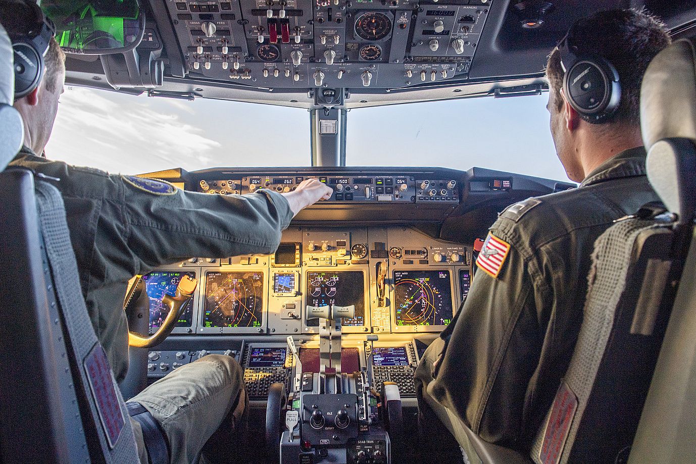 Lt. Levi Ellis, left and Lt. Bradley Woods pilot a P-8A Poseidon assigned to Patrol Squadron (VP) 47 as part of a sinking exercise (SINKEX) during Exercise Pacific Griffin 2019. Pacific Griffin is a biennial exercise conducted in the waters near Guam aimed at enhancing combined proficiency at sea while strengthening relationships between the U.S. and Republic of Singapore navies. U.S. Navy photo by Mass Communication Specialist 1st Class Nathan Carpenter (Released)