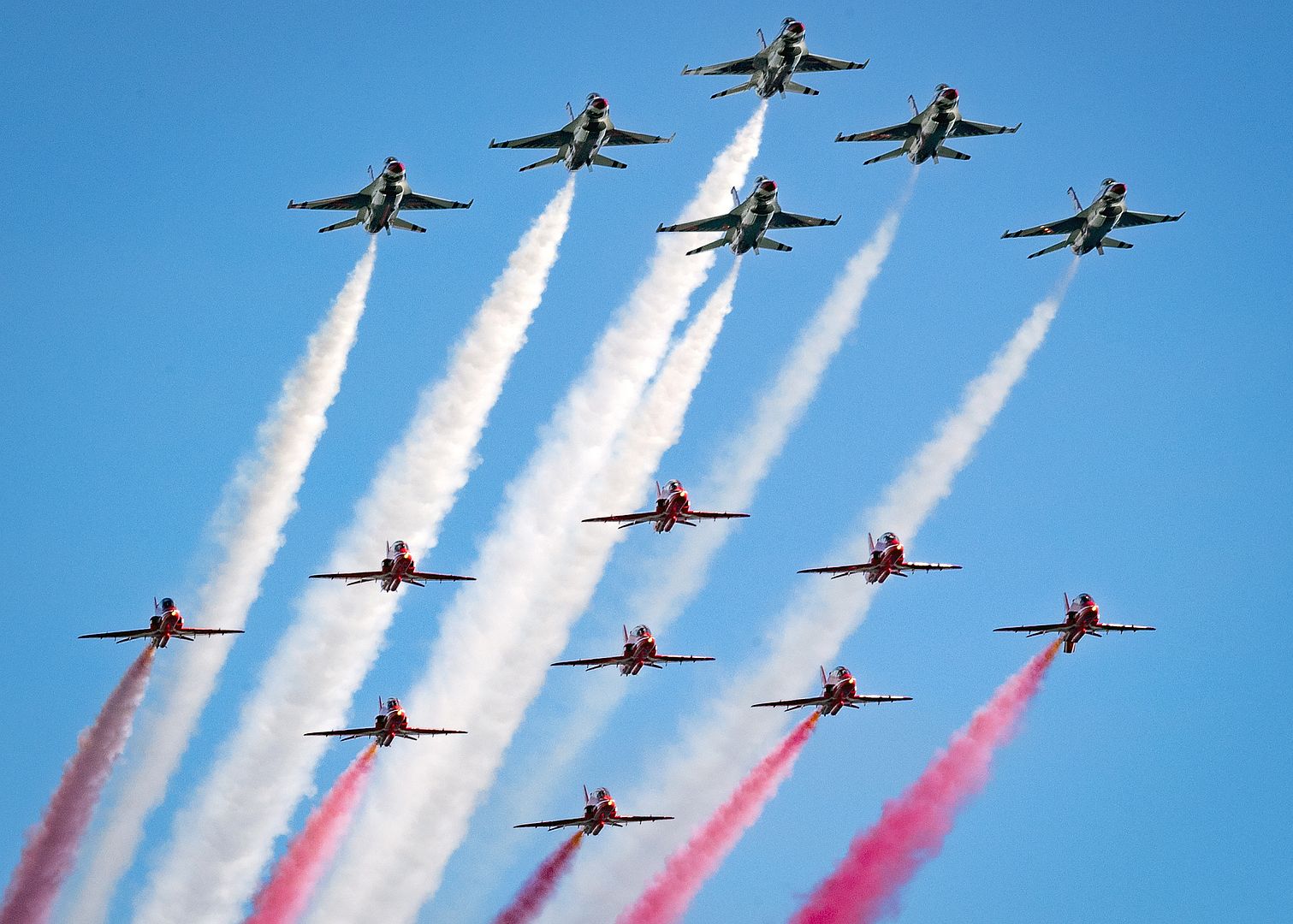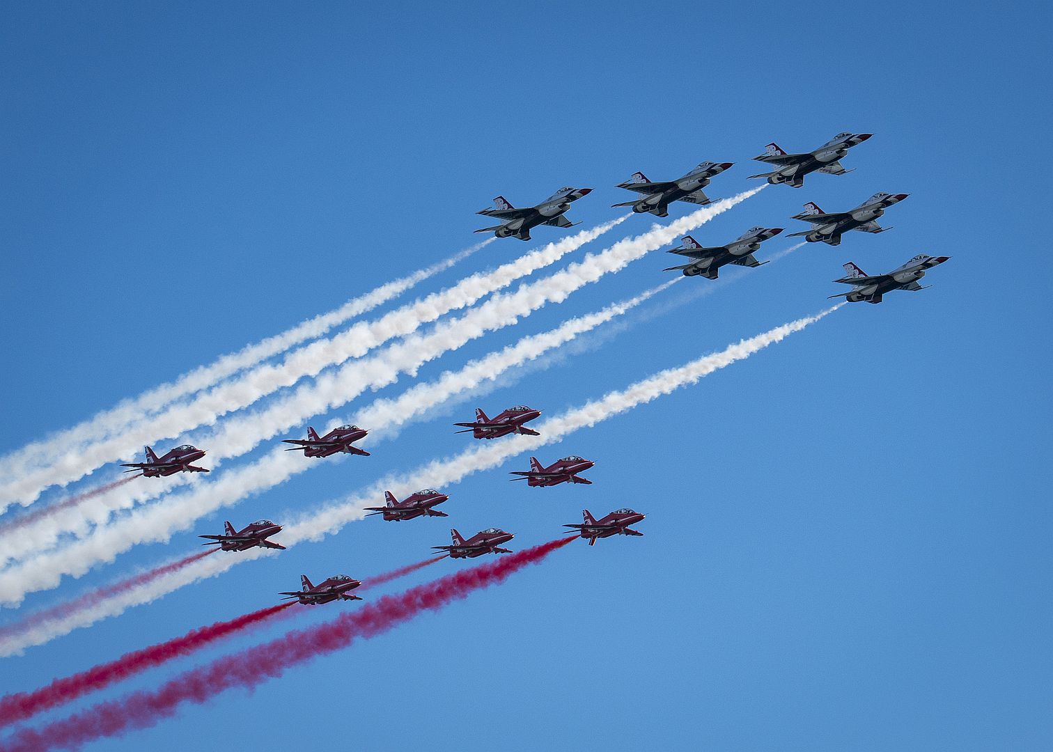 Main AdminThe U.S. Air Force Thunderbirds and the Royal Air Force Red Arrows fly a 15-ship parade-style flat pass to close out the Great Pacific Airshow over Huntington Beach, Calif. Oct. 6, 2019. The photo pass symbolically closed out the Red Arrows North American tour, which spanned the U.S. and Canada over more than 10 weeks with other jet demonstration teams like the U.S. Navy Blue Angels and the Canadian Forces Snowbirds. (U.S. Air Force photo's by Tech. Sgt. Ned T. Johnston and Maj. Ray Geoffroy)