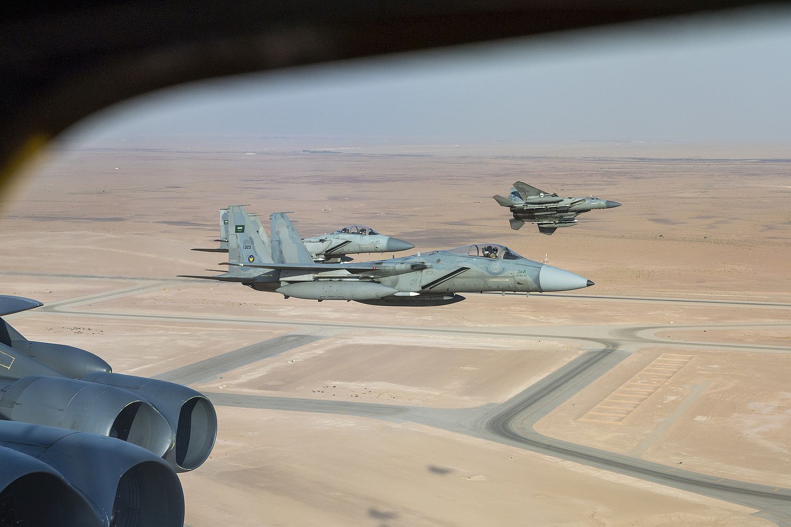 A U.S. Air Force B-52H Stratofortress is escorted by Saudi Arabian F-15C Eagles in support of Bomber Task Force Europe 20-1, Nov. 1, 2019, above Saudi Arabia. The Stratofortress conducted a sortie to the U.S. Central Command area of operations in order to conduct interoperability training with Saudi partners in support of shared regional security interests. (U.S. Air Force photo's by Tech. Sgt. Christopher Ruano)
