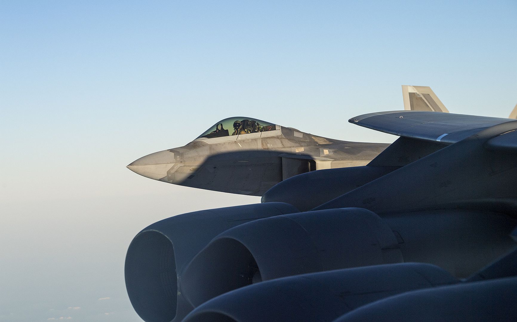 A U.S. Air Force B-52H Stratofortress soars with U.S. Air Force 27th Expeditionary Fighter Squadron F-22 Raptors in the skies of Saudi Arabia in support of Bomber Task Force Europe 20-1, Nov. 1, 2019. The Stratofortress conducted a sortie to the U.S. Central Command area of operations in order to conduct interoperability training with Saudi partners in support of shared regional security interests. (U.S. Air Force photo's by Tech. Sgt. Christopher Ruano)