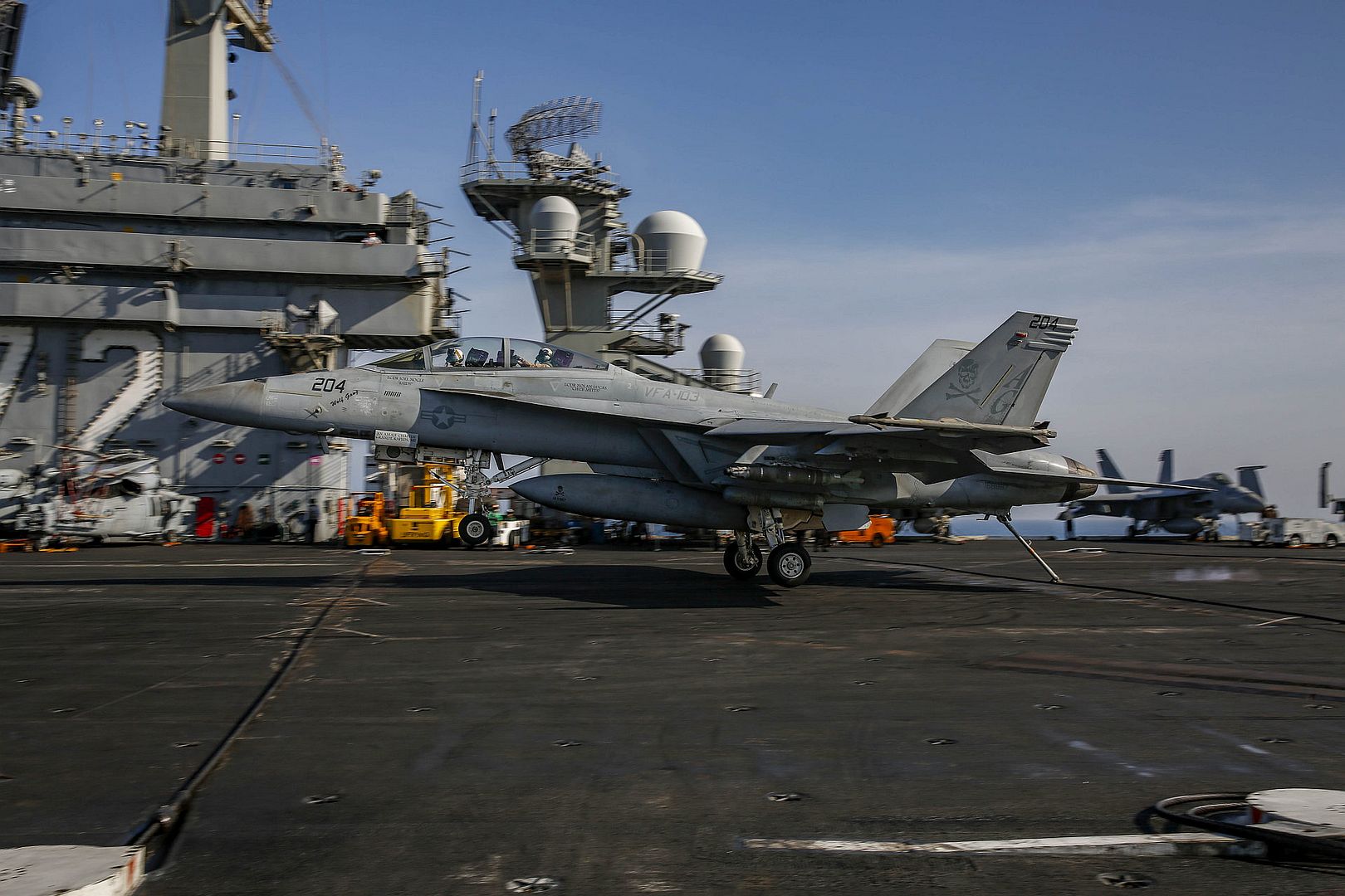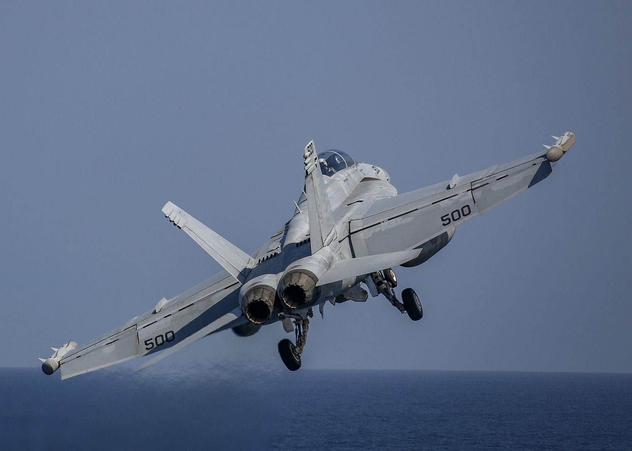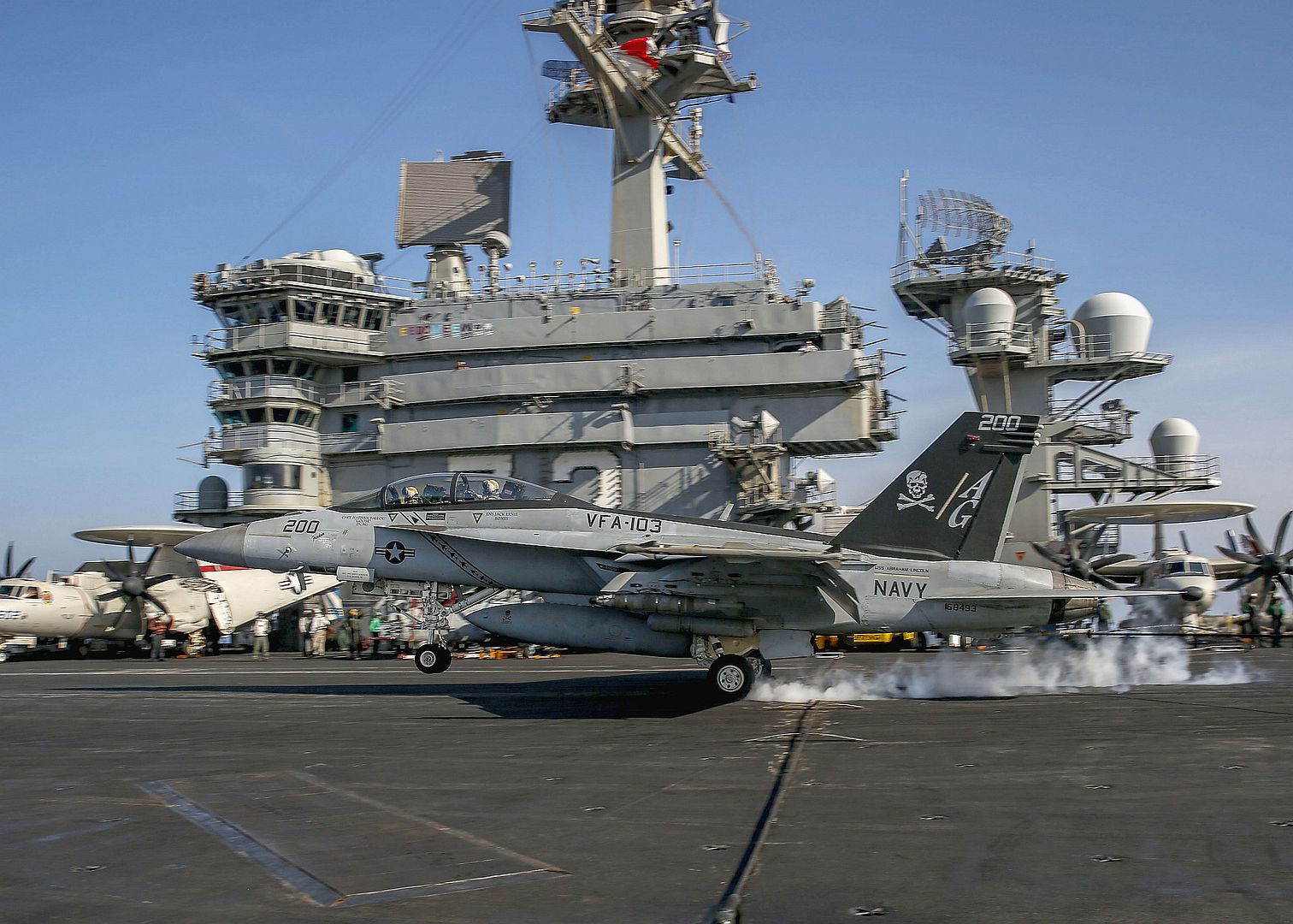 ARABIAN SEA (Oct. 21, 2019) An F/A-18F Super Hornet attached to the "Jolly Rogers" of Strike Fighter Squadron (VFA) 103 approaches the flight deck to make an arrested landing aboard the aircraft carrier USS Abraham Lincoln (CVN 72). The Abraham Lincoln Carrier Strike Group is deployed to the U.S. 5th Fleet area of operations in support of naval operations to ensure maritime stability and security in the Central Region, connecting the Mediterranean and the Pacific through the western Indian Ocean and three strategic choke points. With Abraham Lincoln as the flagship, deployed strike group assets include staffs, ships and aircraft of Carrier Strike Group (CSG) 12, Destroyer Squadron (DESRON) 2, the guided-missile cruiser USS Leyte Gulf (CG 55) and Carrier Air Wing (CVW) 7. (U.S. Navy photo by Mass Communication Specialist 3rd Class Jeremiah Bartelt/Released)