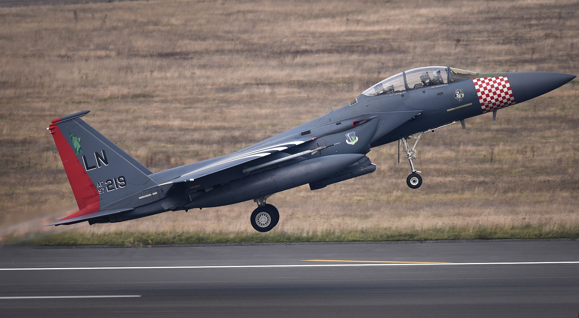 Main AdminAn F-15E Strike Eagle assigned to the 492nd Fighter Squadron takes off at Royal Air Force Lakenheath, England, Oct. 23, 2019. The Strike Eagle is a dual-role fighter designed to perform air-to-air and air-to-ground missions. An array of avionics and electronics systems gives the F-15E the capability to fight at low altitude, day or night and in all weather. (U.S. Air Force photo's by Airman 1st Class Madeline Herzog)