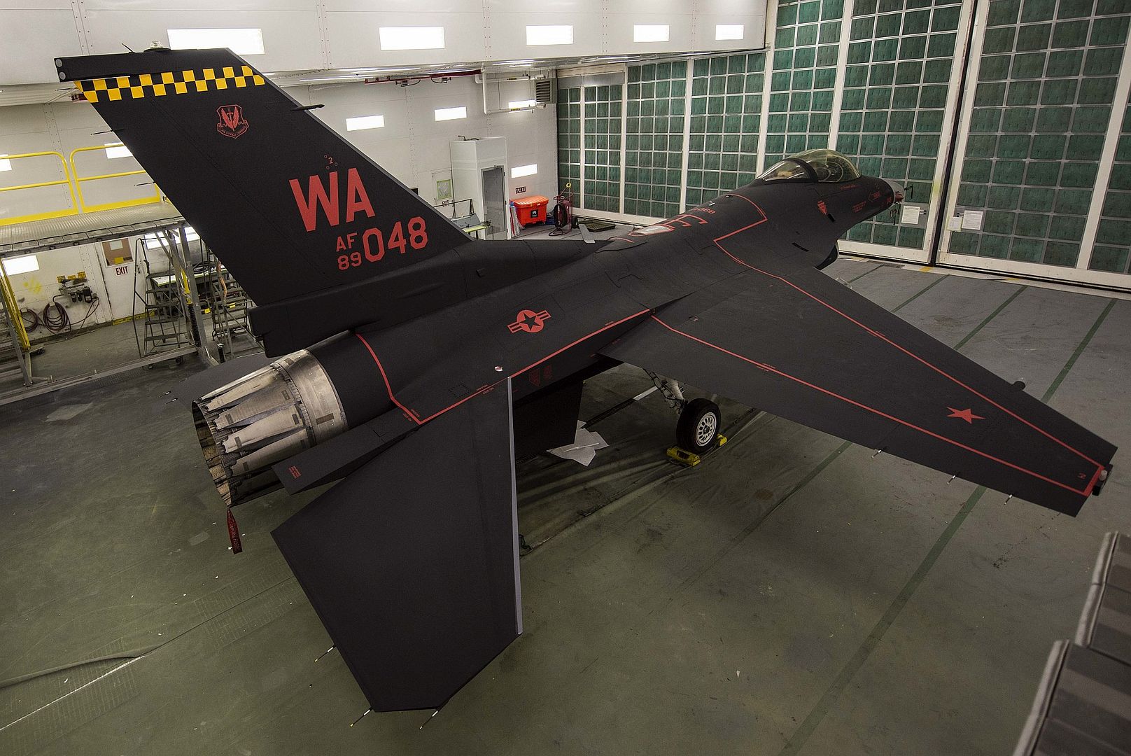 An F-16 Fighting Falcon fighter jet assigned to the 64th Aggressor Squadron is given a new paint scheme in the paint barn at Nellis Air Force Base, Nevada, Oct. 28, 2019. The new design was named the Wraith and replicates an adversary paint scheme. (U.S. Air Force photo's by Senior Airman Miranda A. Loera)