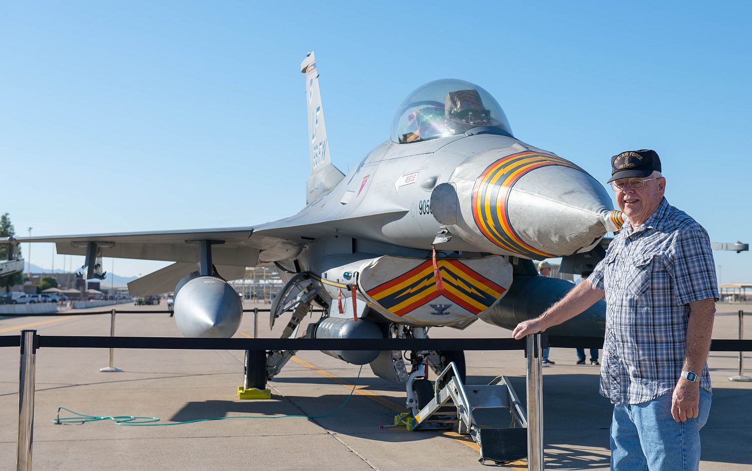 Main AdminJim Ritenour, retired Air Force member, poses in front of an F-16C Fighting Falcon during Retiree Appreciation Day (RAD), Oct. 26, 2019, at Luke Air Force Base, Ariz. Airmen at Luke host RAD to honor retirees and their families by thanking them for their service and sacrifices. Airmen at Luke host RAD annually to show their appreciation to retirees, showcase military new equipment, and offer the retirees a streamlined opportunity to capitalize on services offered at the base such as legal and medical support. (U.S. Air Force photo by Airman Brooke Moeder)