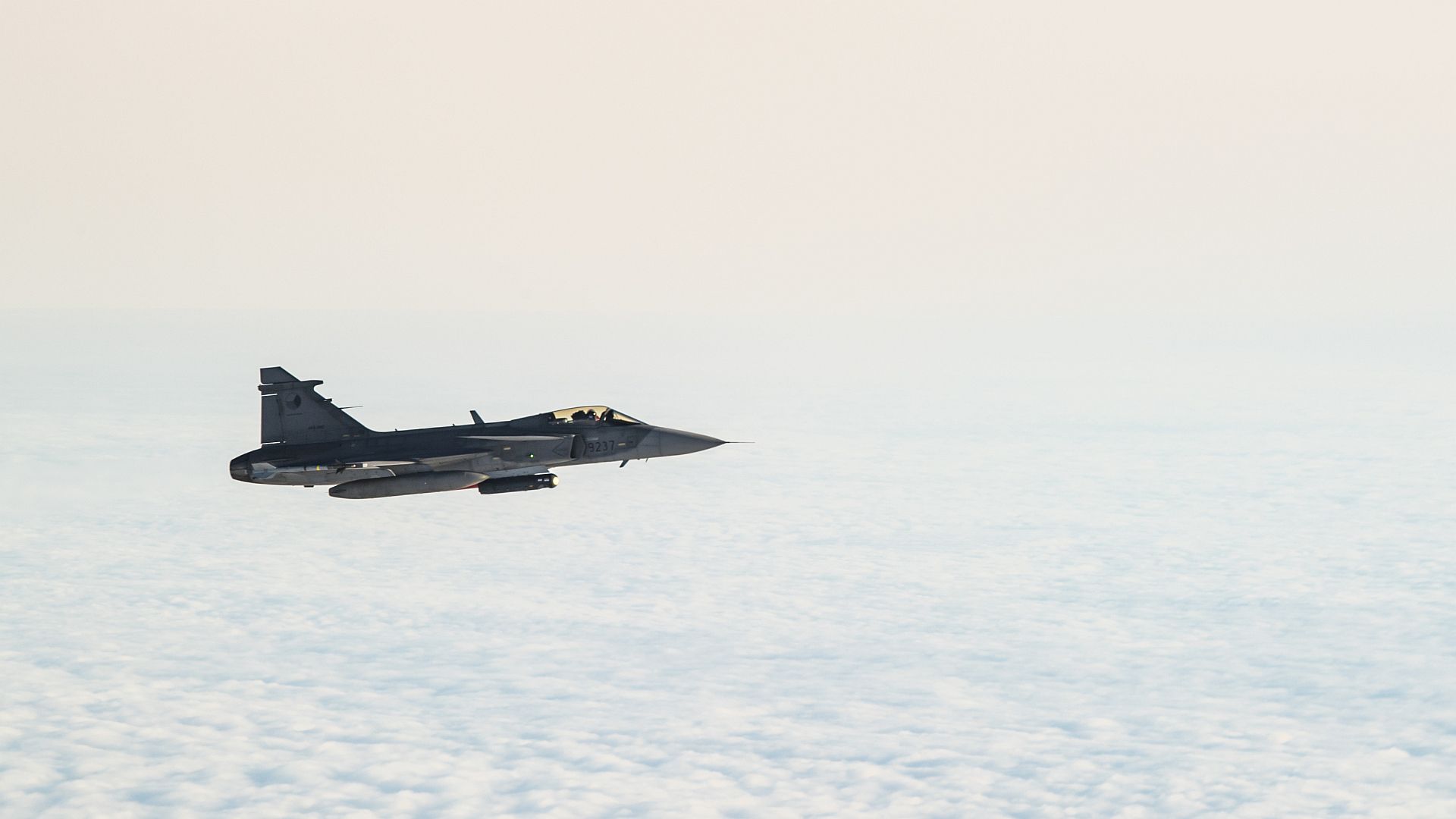 A Czech Air Force JAS-39 Gripen flies in for a planned intercept of a U.S. Air Force B-52 Stratofortress during Bomber Task Force Europe 20-1, Oct. 23, 2019, over the Baltic Sea. This deployment allows Aircrews and support personnel to conduct theater integration and to improve bomber interoperability with joint partners and allied nations. (U.S. Air Force photo by Airman 1st Class Duncan C. Bevan)