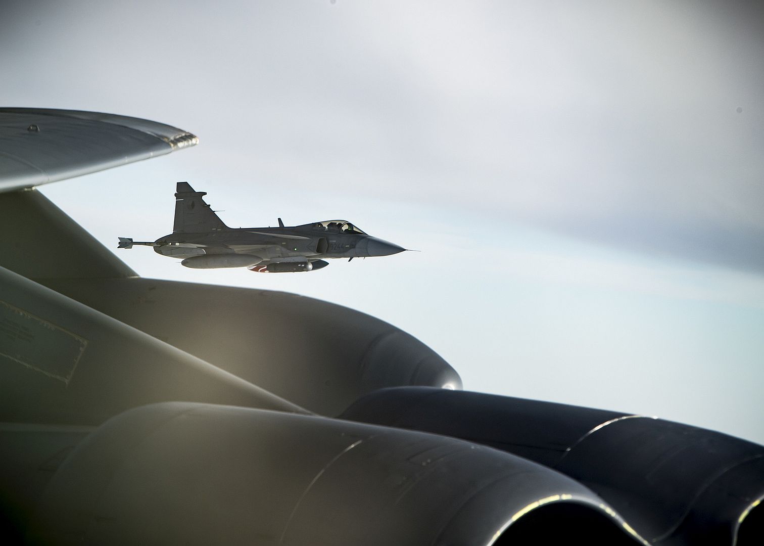 A Czech Air Force JAS-39 Gripen flies next to the wing of a U.S. Air Force B-52 Stratofortress during Bomber Task Force Europe 20-1, Oct. 23, 2019, over the Baltic Sea. This deployment allows Aircrews and support personnel to conduct theater integration and to improve bomber interoperability with joint partners and allied nations. (U.S. Air Force photo by Airman 1st Class Duncan C. Bevan)