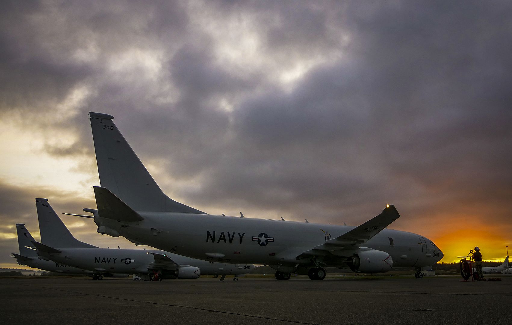 OAK HARBOR, Wash. (Oct. 23, 2019) Three P-8A Poseidons recently assigned to the Grey Knights of Patrol Squadron (VP) 46 sit on the flight line. VP-46 has recently returned from deployment in the U.S. 5th Fleet and U.S. 7th Fleet areas of operations and is making preparations to transition from the P-3C platform to the P-8A Poseidon. (U.S. Navy photo by Mass Communication Specialist 2nd Class Austin Ingram/Released)