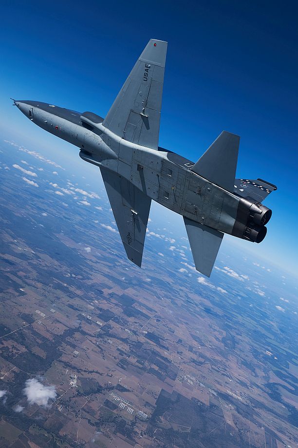 U.S. Air Force Maj. Pol-Enrico Gonzalez 39th Flying Training Squadron pilot, leads a 4-ship of T-38C Talons assigned to the 560 Flying Training Squadron over a military operations area in Southern Texas, Oct. 23, 2019. The flight focused on 4-ship maneuvers and proficiency for instructor pilots completing syllabus training. The 560 FTS qualifies pilots from various airframes as instructor pilots in the T-38 aircraft. (U.S. Air Force photo by MSgt Christopher Boitz)