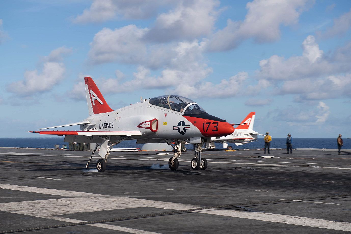 T-45C Goshawk training aircraft assigned to Training Air Wing (TW) 1 land on the flight deck of the aircraft carrier USS John C. Stennis (CVN 74) in the Atlantic Ocean, Oct. 31, 2019. John C. Stennis is underway conducting routine operations in support of Commander, Naval Air Force Atlantic. (U.S. Navy photo's by Mass Communication Specialist 3rd Class Joshua L. Leonard/Released)