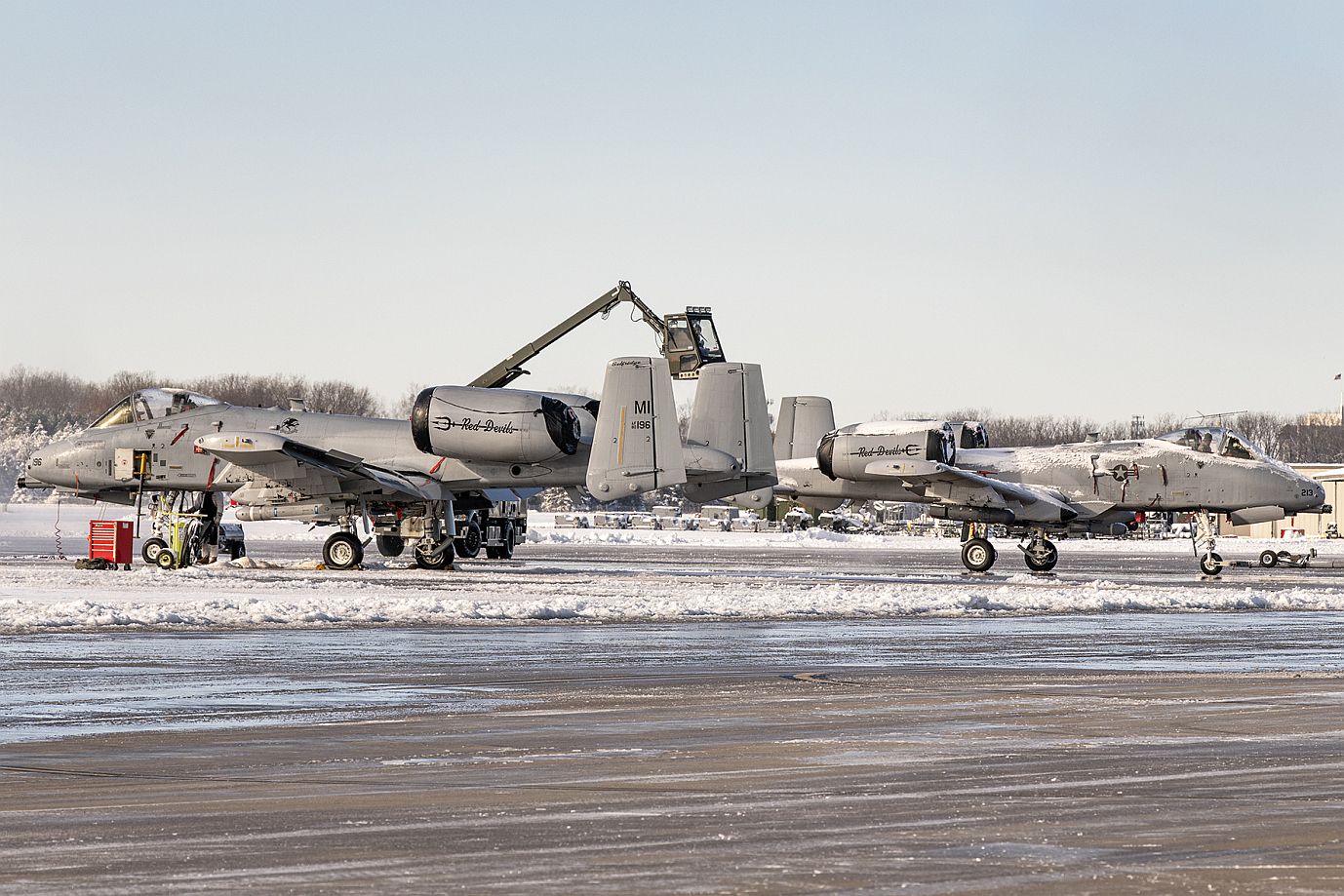 Main Admin127th Maintenance Group Airmen deice an A-10 Thunderbolt II on the flightline at Selfridge Air National Guard Base, Michigan, Nov. 12, 2019. Snow removal from the flightline and deicing of aircraft are very important for maintaining the 127th Wing's aircraft and mission readiness. Despite the cold and Selfridge?s first snowfall this year, Airmen of the 127th Wing continue with their jobs.