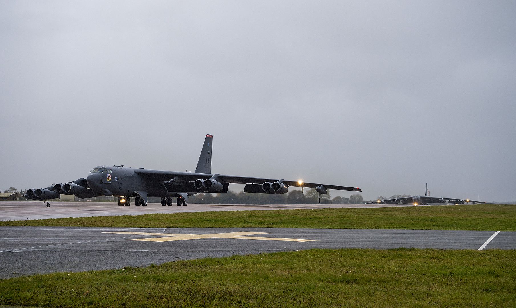 A U.S. Air Force 2nd Bomb Wing B-52H Stratofortress from Barksdale Air Force Base, Louisiana, taxis on the flight line in support of Bomber Task Force Europe 20-1, Nov. 8, 2019, at RAF Fairford, England. This deployment allowed aircrews and support personnel to conduct theater integration and improve bomber interoperability with joint partners and allied nations. (U.S. Air Force photo by Tech. Sgt. Christopher Ruano)
