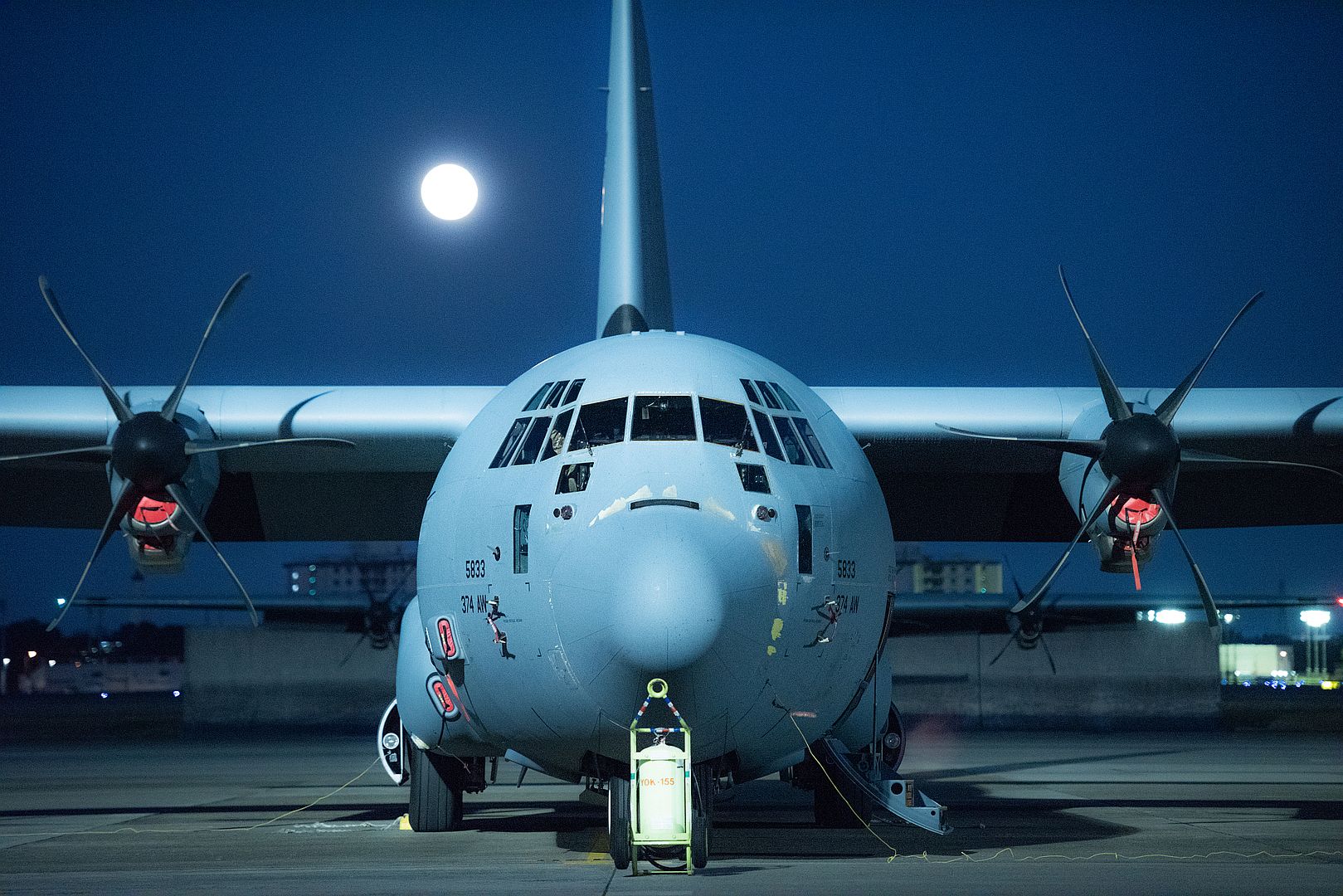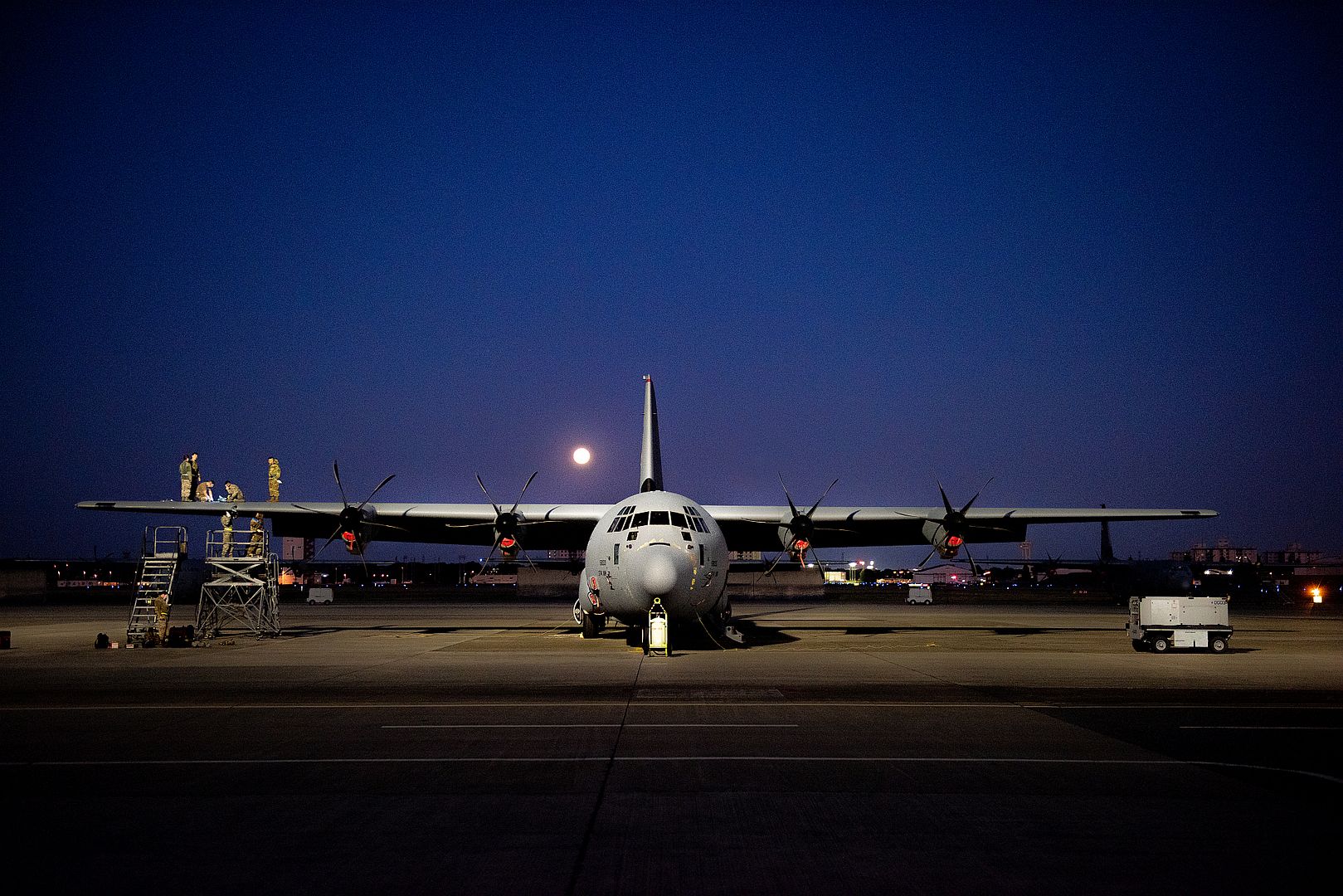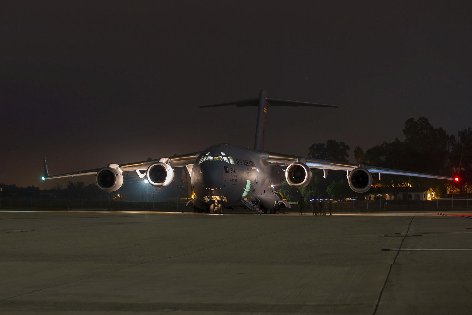The crew of a U.S. Air Force C-17 Globemaster III unloads in the dark of night on Marine Corps Air Station Camp Pendleton, California, Nov. 7, 2019. The air station provides the Marines and sailors of I Marine Expeditionary Force and 3rd Marine Aircraft Wing with flexible deployment options. While the air station primarily supports rotary wing and tiltrotor aircraft, it is also capable of landing large aircraft like the C-17. (U.S. Marine Corps photo by Lance Cpl. Andrew Cortez)
