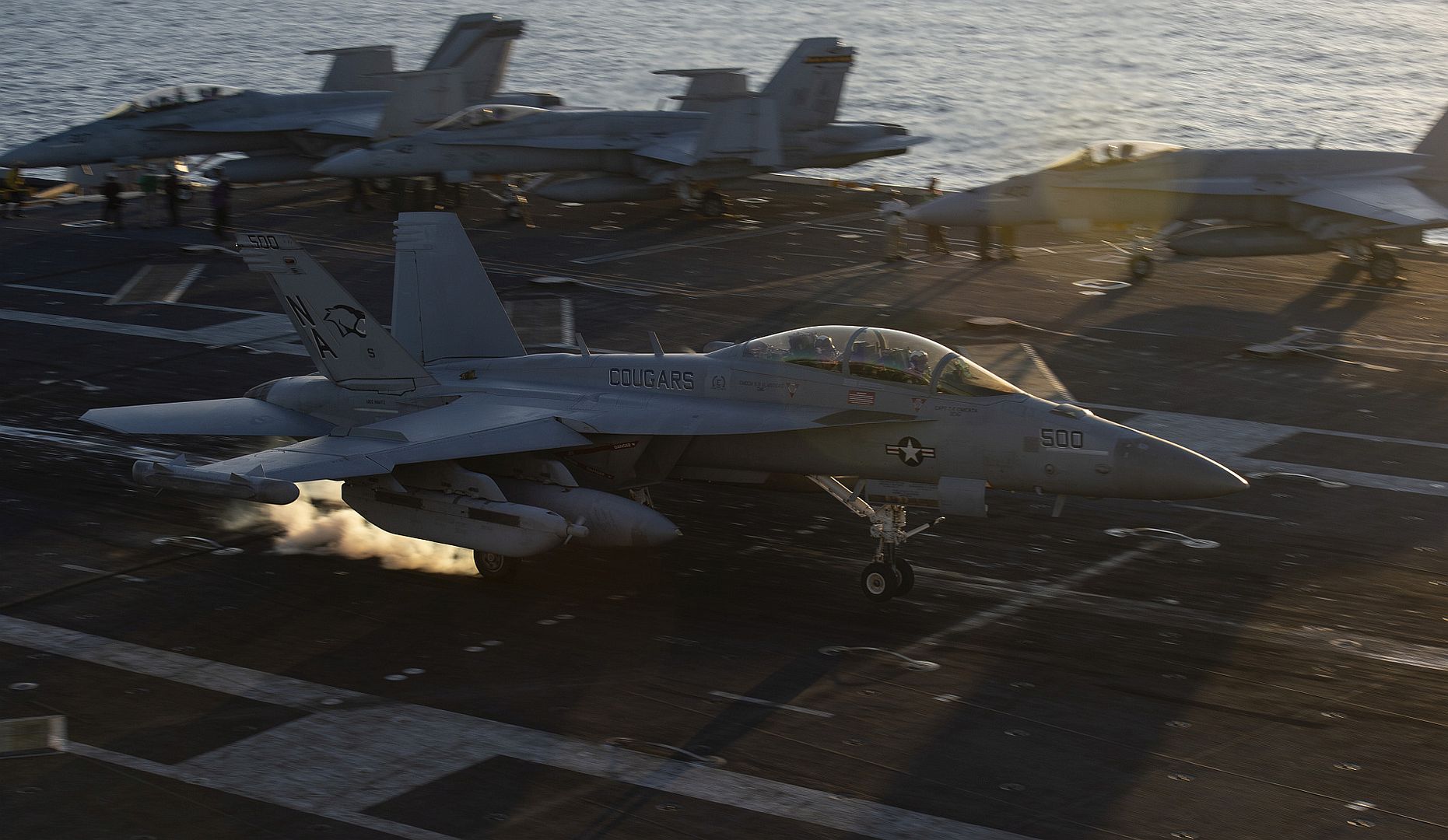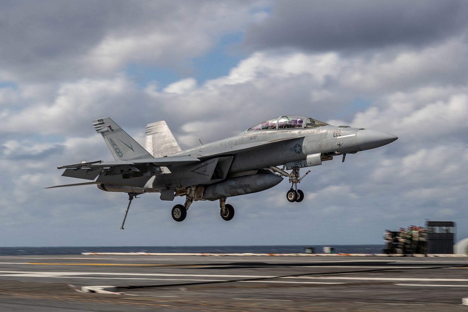 An F/A-18F Super Hornet, assigned to Strike Fighter Squadron (VFA) 211, lands on the flight deck of the aircraft carrier USS John C. Stennis (CVN 74) in the Atlantic Ocean, Nov. 9, 2019. The John C. Stennis is underway conducting routine operations in support of Commander, Naval Air Force Atlantic. (U.S. Navy photo by Mass Communication Specialist 2nd Class Grant G. Grady)