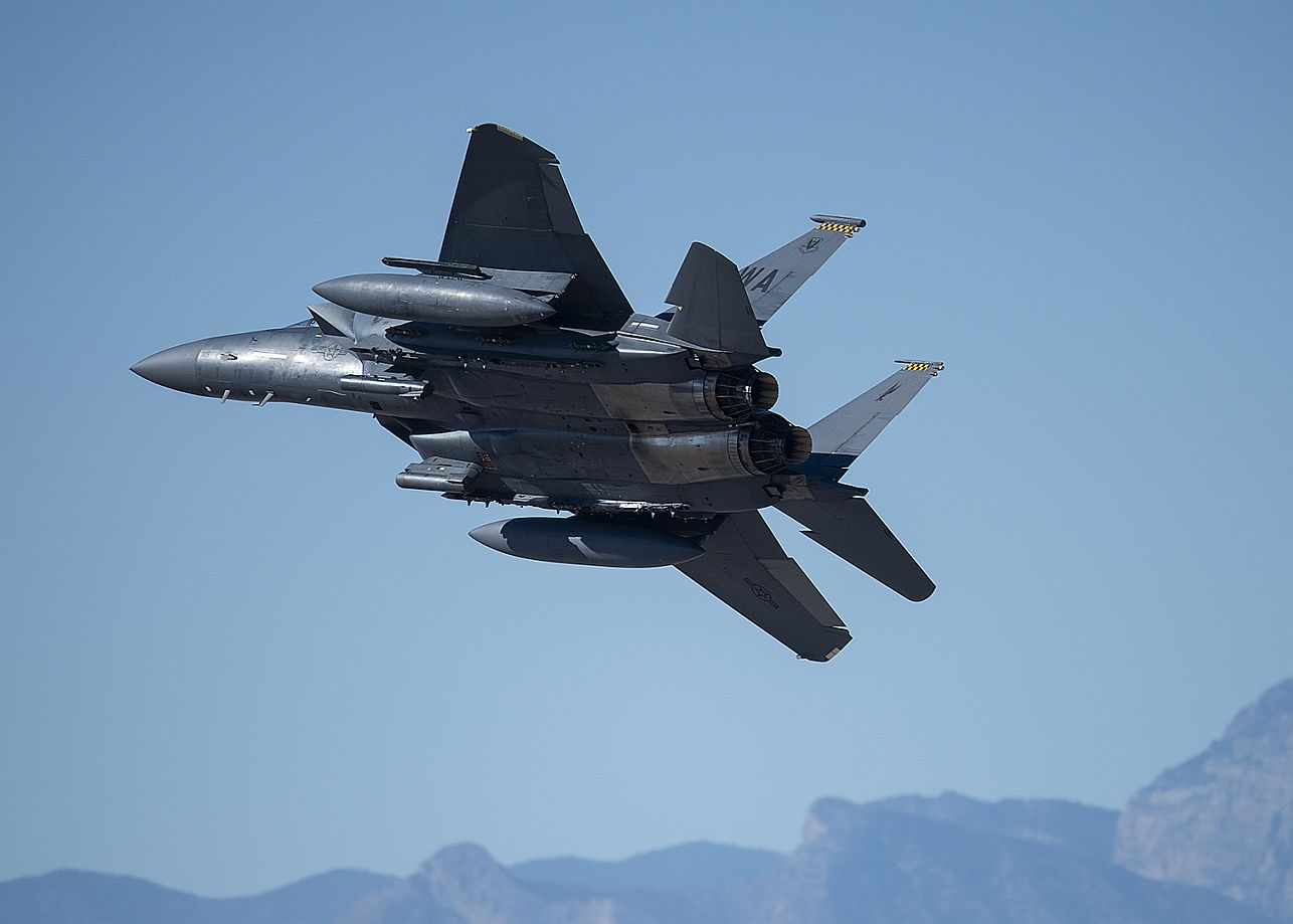 An F-15E Strike Eagle assigned to the 17th Weapons Squadron performs an air maneuver during the Aviation Nation 2019 air show at Nellis Air Force Base, Nevada, Nov. 16, 2019. The F-15E is a dual-role fighter designed to perform air-to-air and air-to-ground missions at low altitudes, day or night and in all weather conditions. (U.S. Air Force photo by Airman 1st Class Bryan Guthrie)