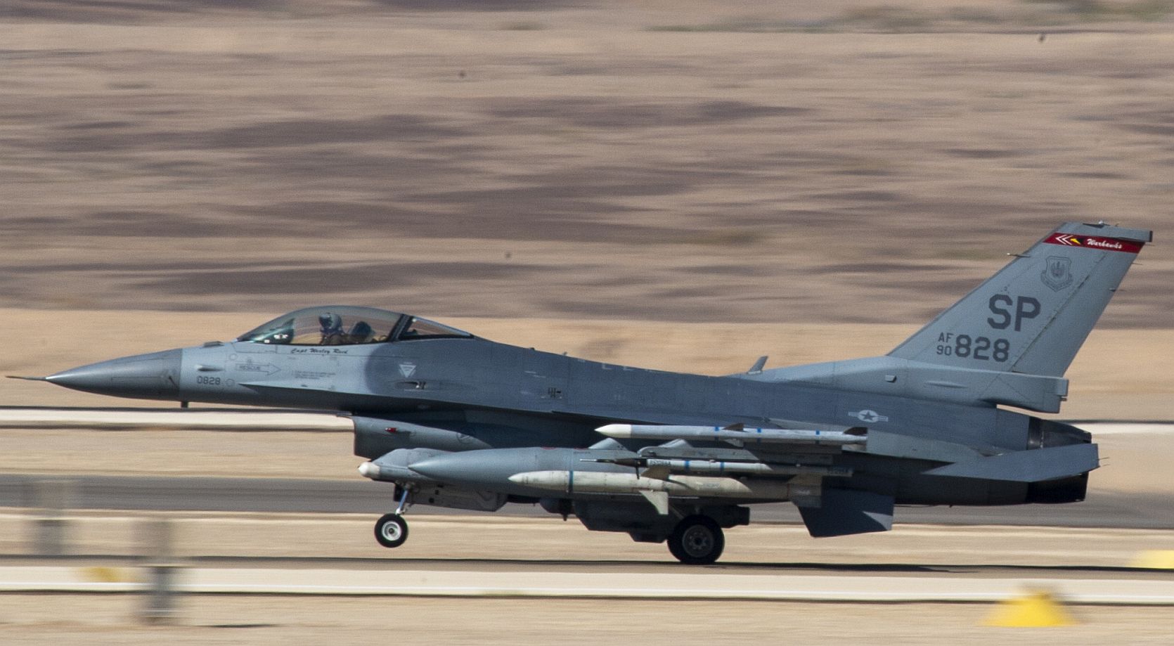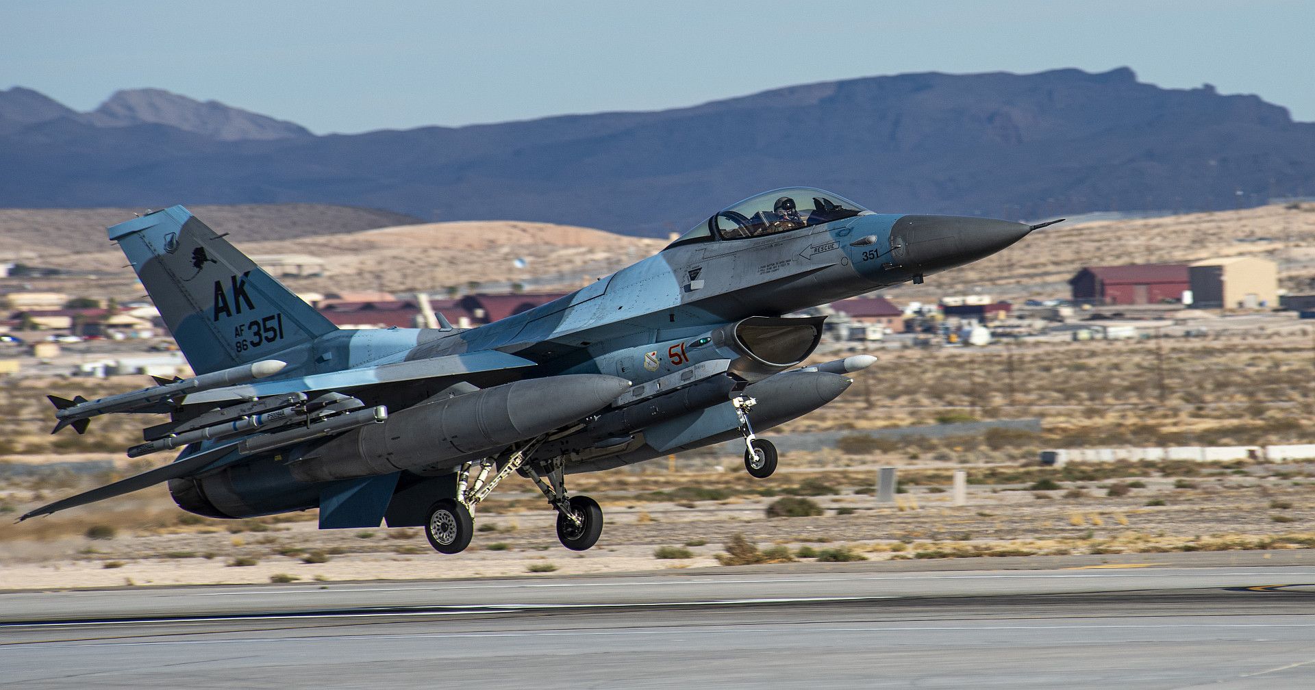 A U.S. Air Force F-16 Fighting Falcon, 480th Expeditionary Fighter Squadron, takes off during Blue Flag 2019 at Uvda Air Base, Israel, November 4, 2019. Blue Flag is an opportunity to improve interoperability and build relationships between the US and multinational partners and allies. (U.S. Air Force photo by Airman 1st Class Kyle Cope)