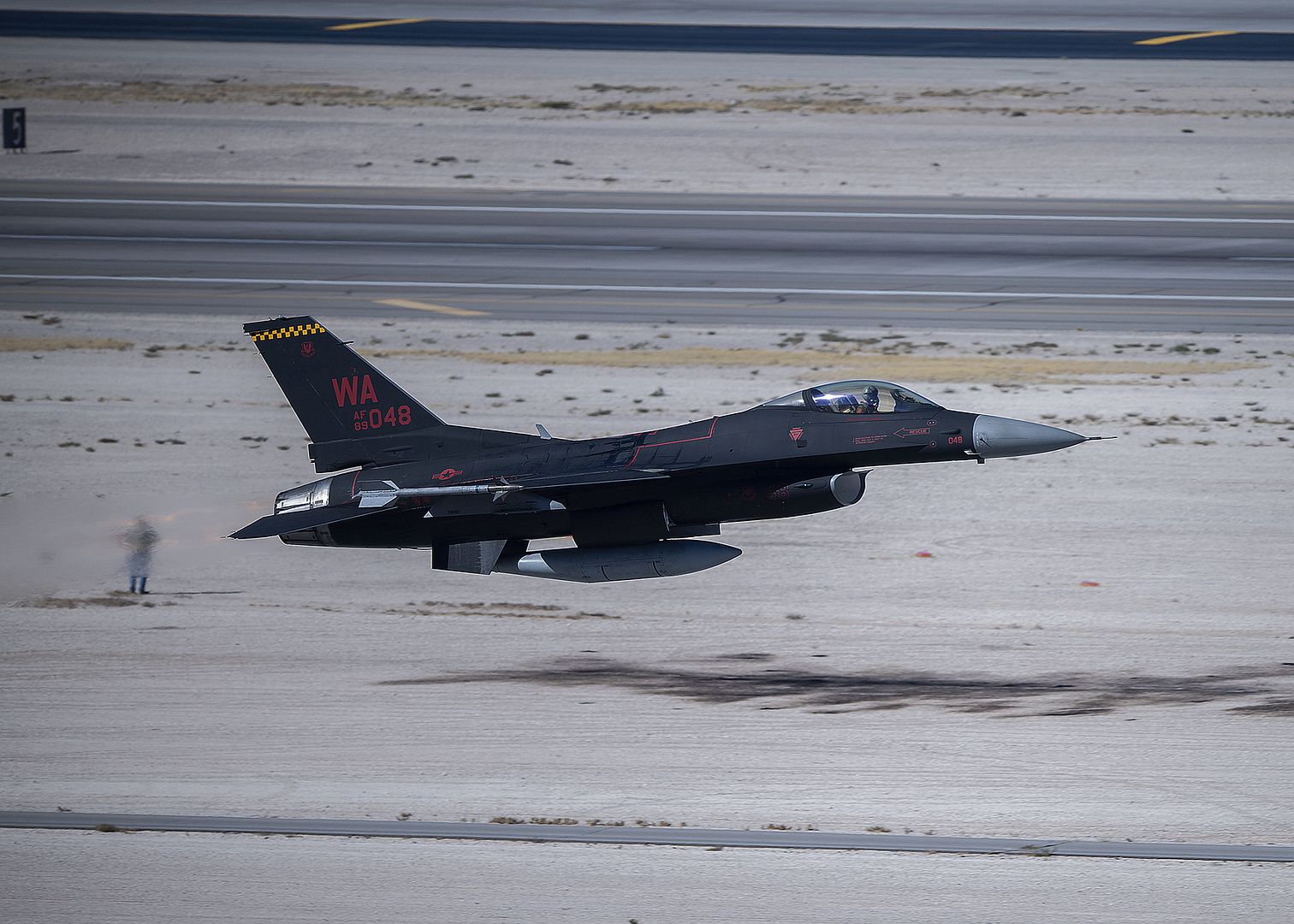 An F-16 Fighting Falcon fighter jet assigned to the 64th Aggressor Squadron takes off during Aviation Nation air show 2019 at Nellis Air Force Base, Nevada, Nov. 16, 2019. The Aggressor paint scheme ?Wraith? was chosen by a social media poll held by Brig. Gen. Robert Novotny, 57th Wing commander. (U.S. Air Force photo by Airman 1st Class Bryan Guthrie)