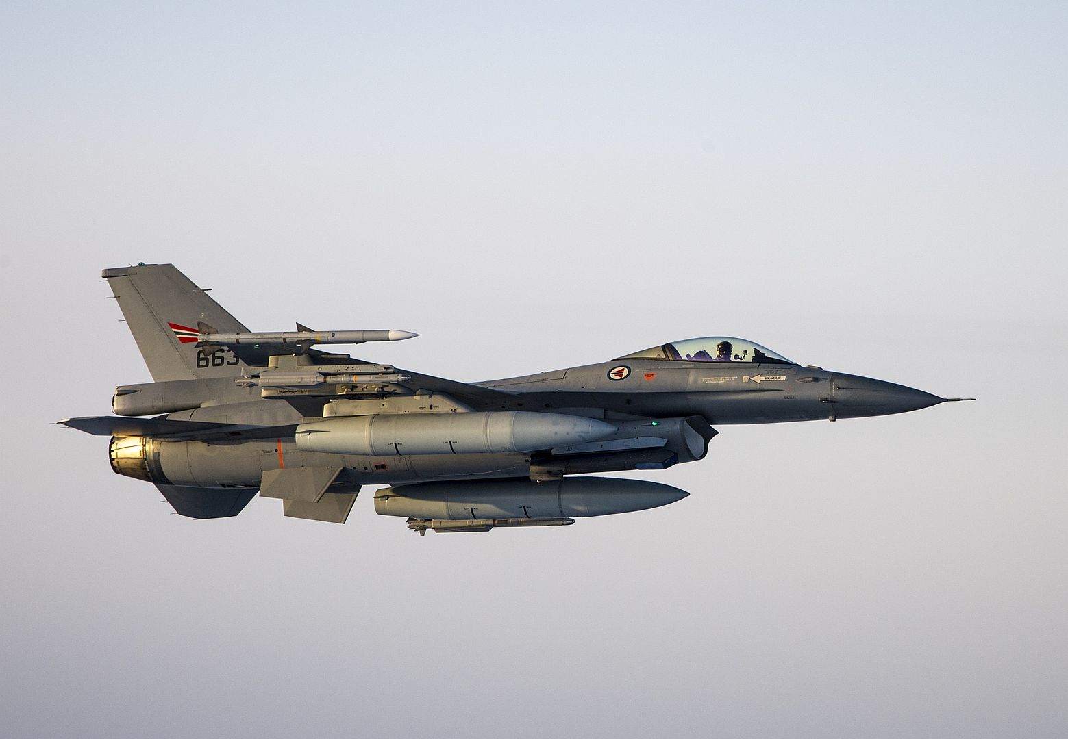 A Royal Norwegian Air Force F-16 Fighting Falcon flies over the Barents Sea region during Bomber Task Force Europe 20-1, Nov. 6, 2019. This deployment allows aircrews and support personnel to conduct theater integration and to improve bomber interoperability with joint partners and allied nations. (U.S. Air Force photo by Airman 1st Class Duncan C. Bevan)