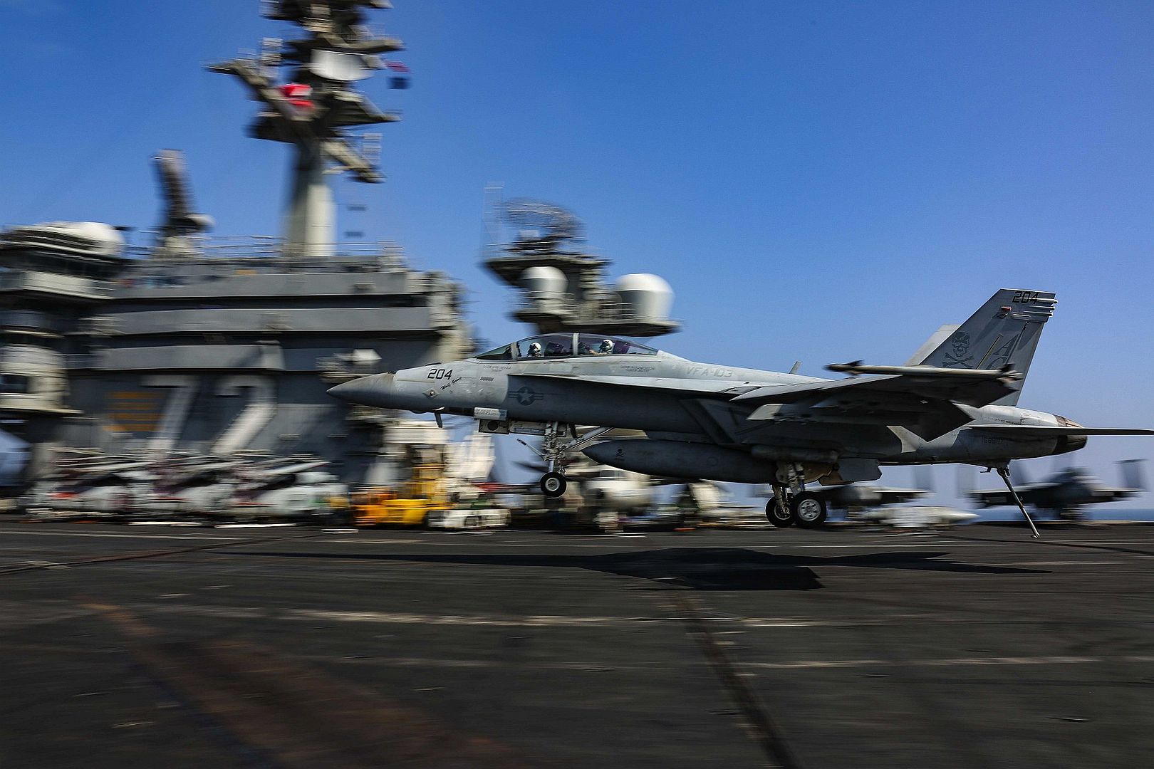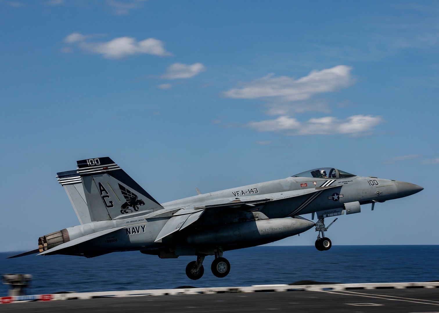 ARABIAN SEA (Nov. 6, 2019) An F/A-18F Super Hornet attached to the "Jolly Rogers" of Strike Fighter Squadron (VFA) 103 approaches the flight deck of the aircraft carrier USS Abraham Lincoln (CVN 72). Abraham Lincoln Carrier Strike Group is deployed to the U.S. 5th Fleet area of operations in support of naval operations to ensure maritime stability and security in the Central Region, connecting the Mediterranean and the Pacific through the western Indian Ocean and three strategic choke points. With Abraham Lincoln as the flagship, deployed strike group assets include staffs, ships and aircraft of Carrier Strike Group 12 (CSG 12), Destroyer Squadron 2 (DESRON 2), USS Leyte Gulf (CG 55) and Carrier Air Wing 7 (CVW 7). (U.S. Navy photo by Mass Communication Specialist 3rd Class Jeremiah Bartelt/Released)
