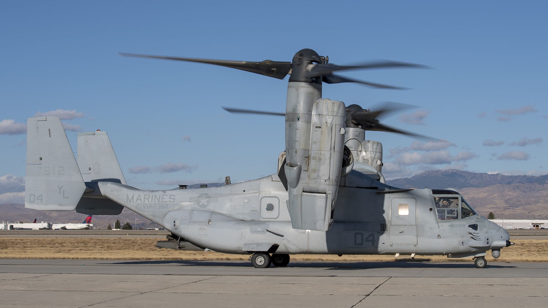 Marines from the Marine Medium Tiltrotor Squadron 362 (VMM-362), based out of Marine Corps Air Station Miramar, California, prepare to fly their MV-22 Ospreys out of Gowen Field, Boise, Idaho, Nov. 19, 2019. The Ugly Angels are training hand-in-hand with the 190th Fighter Squadron Skullbangers to hone their combat search and rescue skillset at the Saylor Creek Range south of Mountain Home, Idaho. (U.S. Air National Guard photo by Senior Master Sgt. Joshua C. Allmaras)