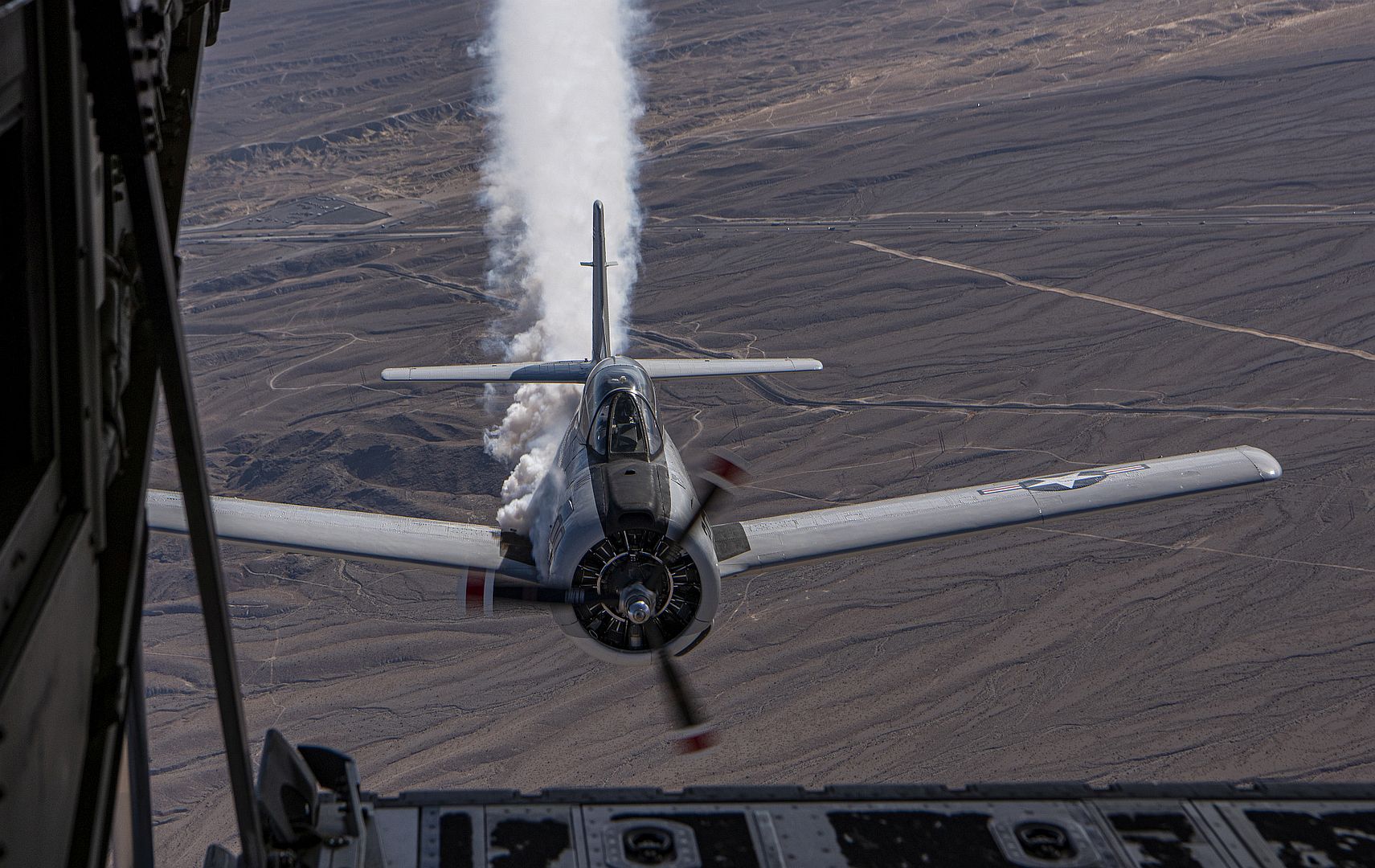 A U.S. Marine Corps T-28 Trojan aircraft, pops smoke over Nellis Air Force Base, Nevada, Nov. 15, 2019. The historic aircraft assisted an HC-130J Combat King II aircraft and U.S. Special Operations Command Para-Commandos in a parachute demonstration at Aviation Nation 2019. (U.S. Air Force photo by Airman 1st Class Dwane R. Young)