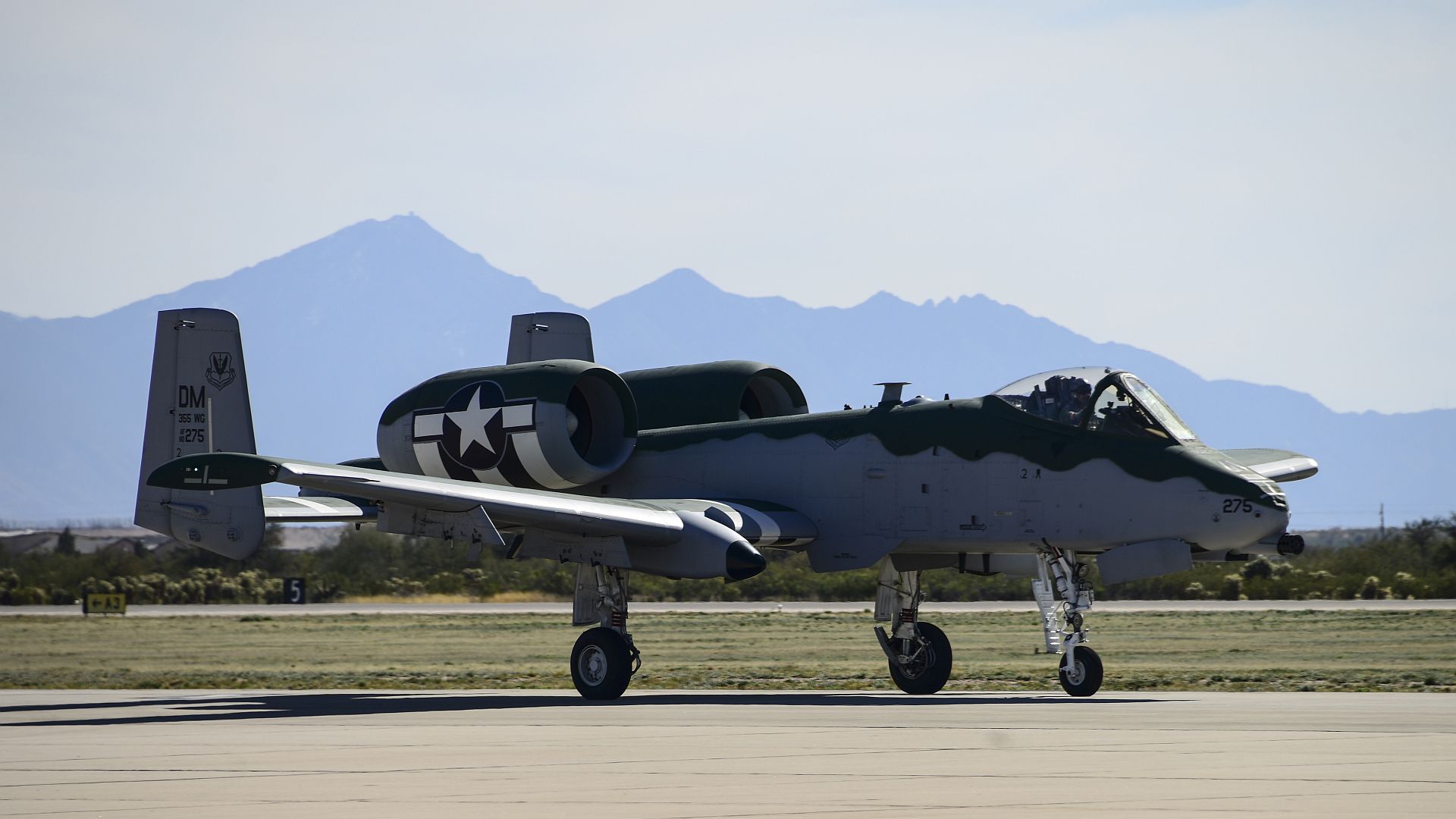 The U.S. Air Force A-10C Thunderbolt II Demonstration Team aircraft taxis on the flight line at Davis-Monthan Air Force Base, Arizona, Feb. 18, 2020. The A-10 was repainted to resemble a World War II era P-51 Mustang in a tribute to heritage. (U.S. Air Force photo by Airman 1st Class Jacob T. Stephens)