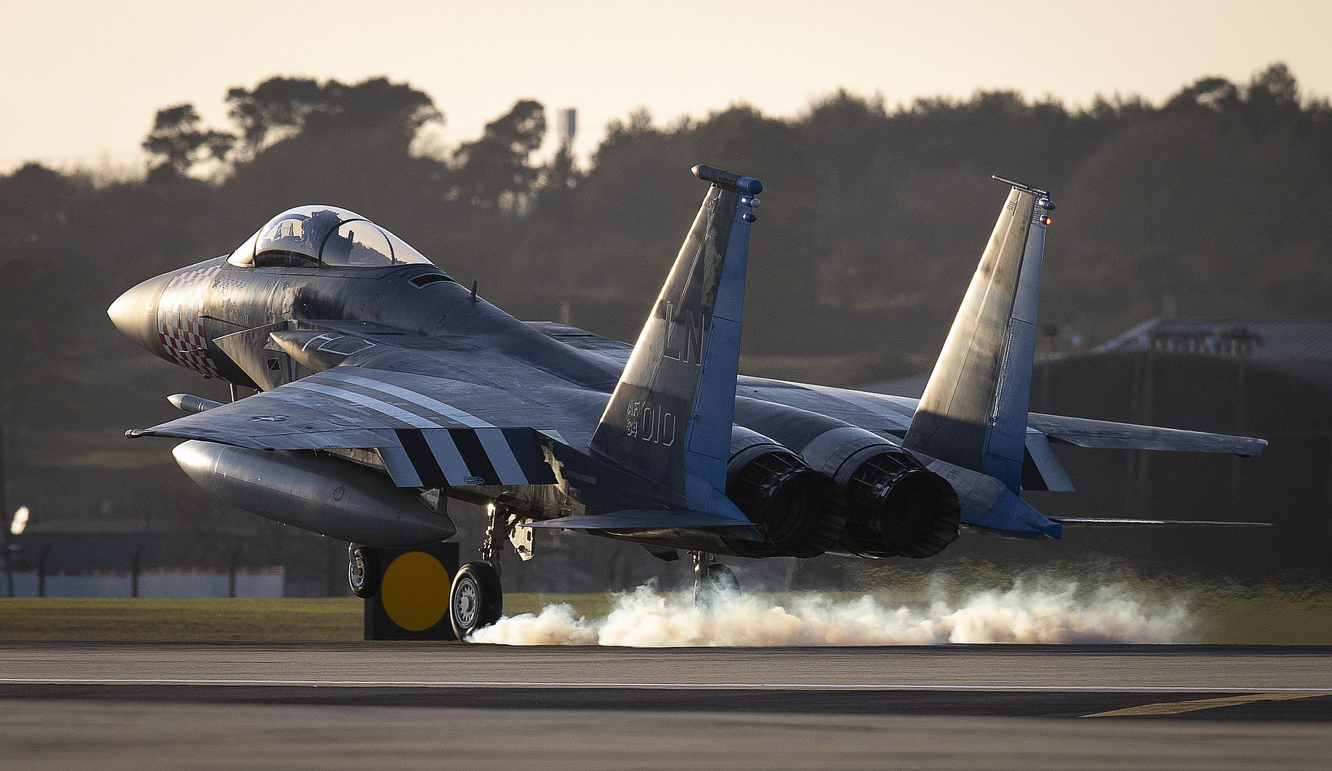 An F-15C Eagle assigned to the 493rd Fighter Squadron lands at Royal Air Force Lakenheath, England, during a ?Furious 48? exercise Feb. 11, 2020. The readiness exercise spans two days and is intended to prepare U.S. Air Force personnel for sustained combat operations during contested and degraded environments. (U.S. Air Force photo by Airman 1st Class Madeline Herzog)