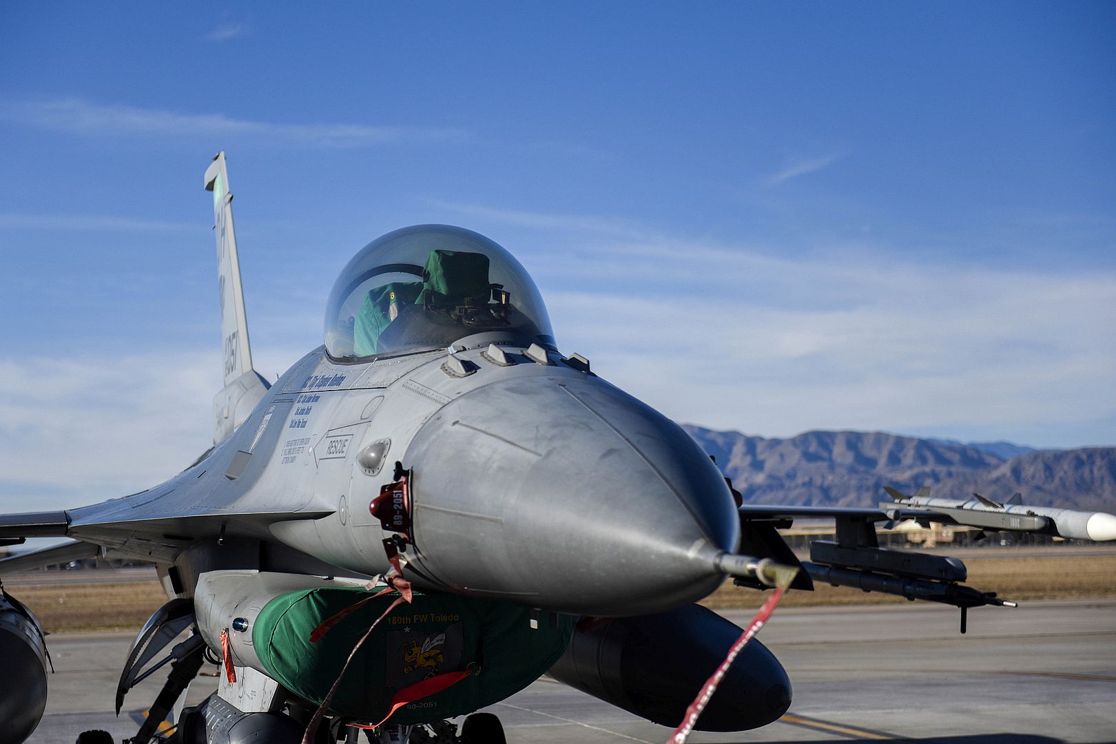 F-16 fighter jets assigned to the Ohio National Guard?s 180th Fighter Wing taxi from the runway at Nellis Air Force Base, Nevada, during exercise Green Flag-West, Feb. 13, 2020 Green Flag is a realistic, air-to-surface, joint training exercise designed to improve interoperability between aircraft while supporting ground troops by allowing U.S. military branches, as well as other NATO and allied nations, an opportunity to work together, as they would in military operations around the world.