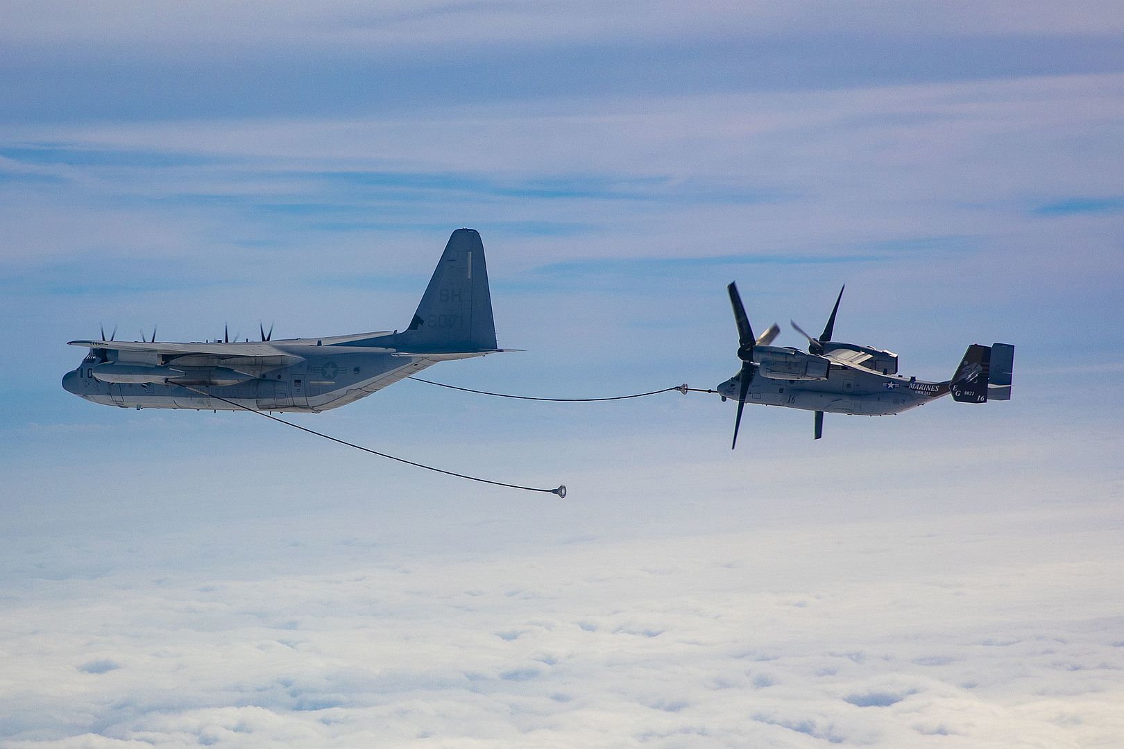 A MV-22B Osprey with Medium Tiltrotor Squadron VMM-263 receives fuel from a KC-130J Super Hercules from Marine Aerial Refueler Transportation Squadron 252 over the Atlantic Feb. 12, 2020. The Osprey refueled mid-flight during a tactical recovery of air-craft and personnel exercise. (U.S. Marine Corps photo by Cpl. Antonio Garcia/Released)