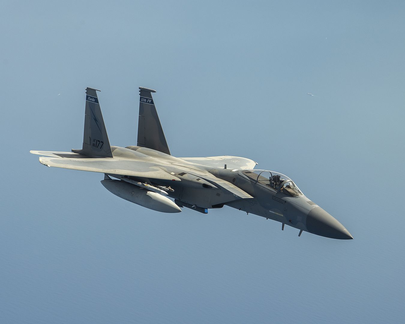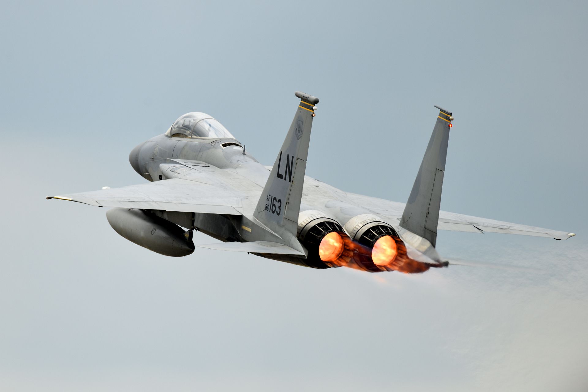 An F-15C Eagle assigned to the 493rd Fighter Squadron takes off from Royal Air Force Lakenheath, England, May 27, 2020. During a large force exercise with other U.S. Air Forces in Europe-Air Forces Africa units, 48th Fighter Wing aircrew conducted Dissimilar Air Combat Training in order to enhance combat readiness and increase tactical proficiency needed to maintain a ready force capable of ensuring the collective defense of the NATO alliance. (U.S. Air Force photo by Senior Airman Christopher S. Sparks)