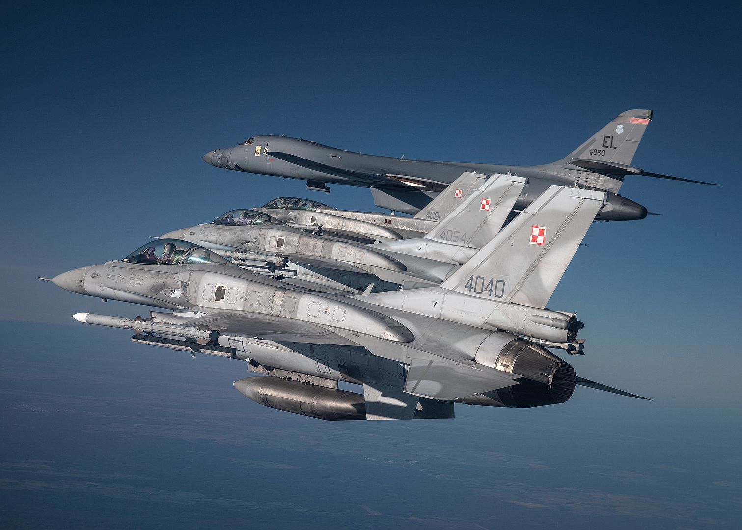 Polish F-16s escort a B1B Lancer during a training mission for Bomber Task Force Europe, May 29, 2020. Aircrews from the 28th Bomb Wing at Ellsworth Air Force Base, South Dakota, took off on their long-range, long-duration Bomber Task Force mission to conduct interoperability training in the Black Sea region. Training with our NATO allies and theater partner nations contribute to enhanced resiliency and interoperability and enables us to build enduring relationships necessary to confront the broad range of global challenges. (Courtesy photo's by Polish Air Force)