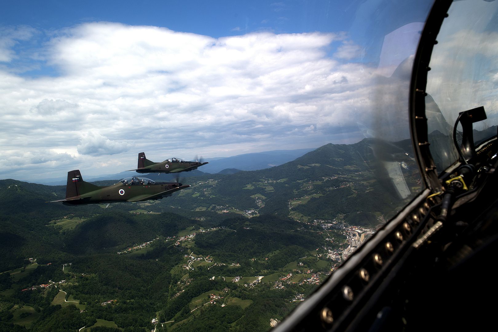 Slovenian Pilatus PC-9s fly over Slovenia while training with 31st Fighter Wing aircraft, June 1, 2020. The 31st FW routinely trains with Slovenia increasing their interoperability and strengthening the NATO alliance. (U.S. Air Force photo by Senior Airman Caleb House)