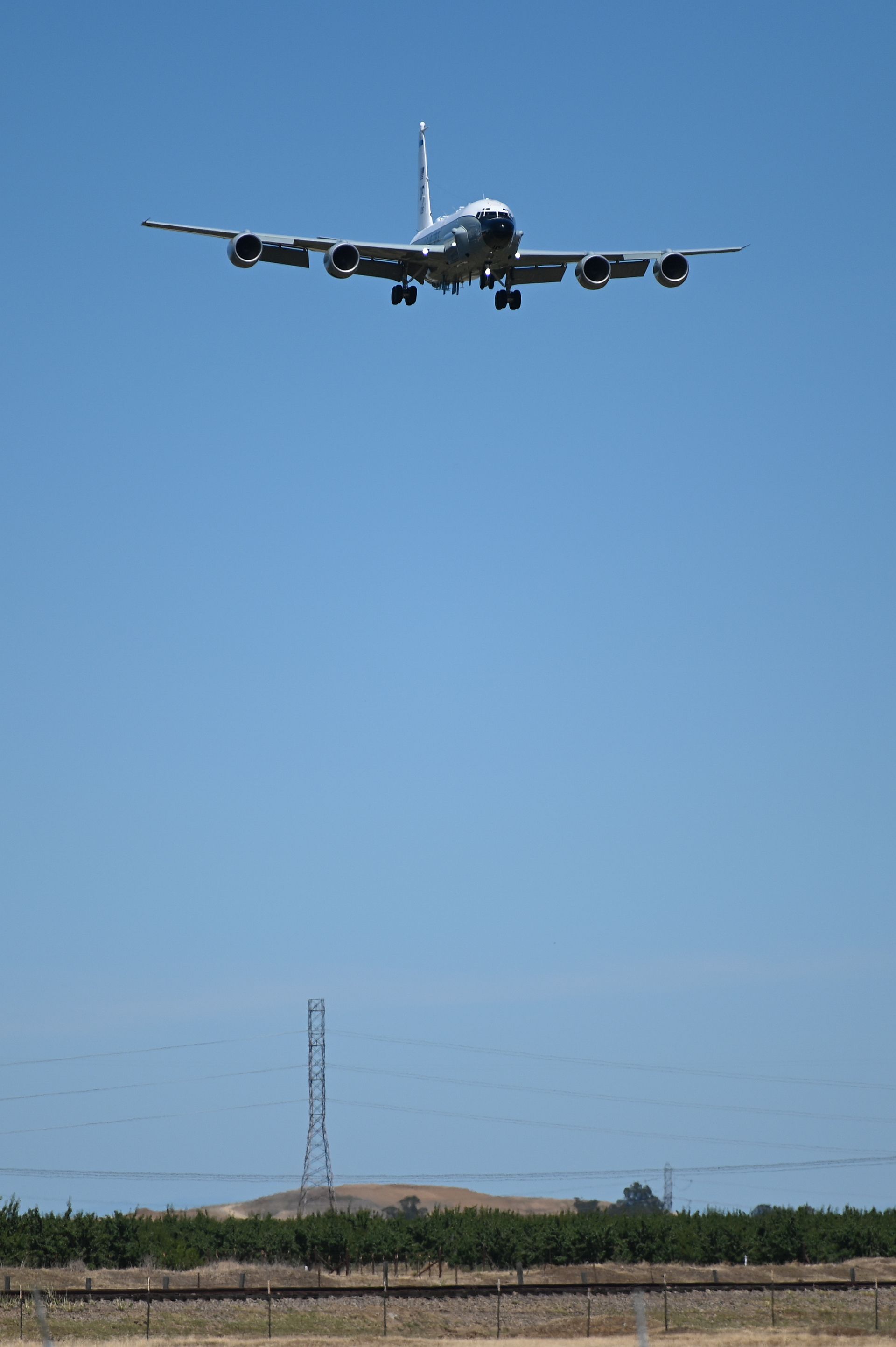 An RC-135S Cobra Ball from Offutt Air Force Base, Nebraska, descends toward the runway May 23, 2020, at Travis Air Force Base, California. Several RC-135S aircraft have been displaced to Travis as a precaution for pending inclement weather in the Offutt area. (U.S. Air Force photo's by Senior Airman Amy Younger)