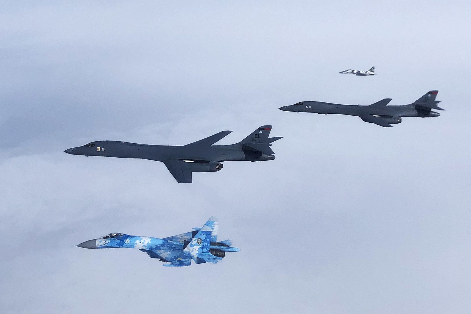 A Ukrainian Su-27 Flanker and MiG-29 Fulcrum escort two B1B Lancers during a training mission for Bomber Task Force Europe, May 29, 2020. Aircrews from the 28th Bomb Wing at Ellsworth Air Force Base, South Dakota, took off on their long-range, long-duration Bomber Task Force mission to conduct interoperability training throughout Europe and the Black Sea region. Training with our NATO allies and theater partner nations contribute to enhanced resiliency and interoperability and enables us to build enduring relationships necessary to confront the broad range of global challenges. (Courtesy photo by Ukrainian Air Force)