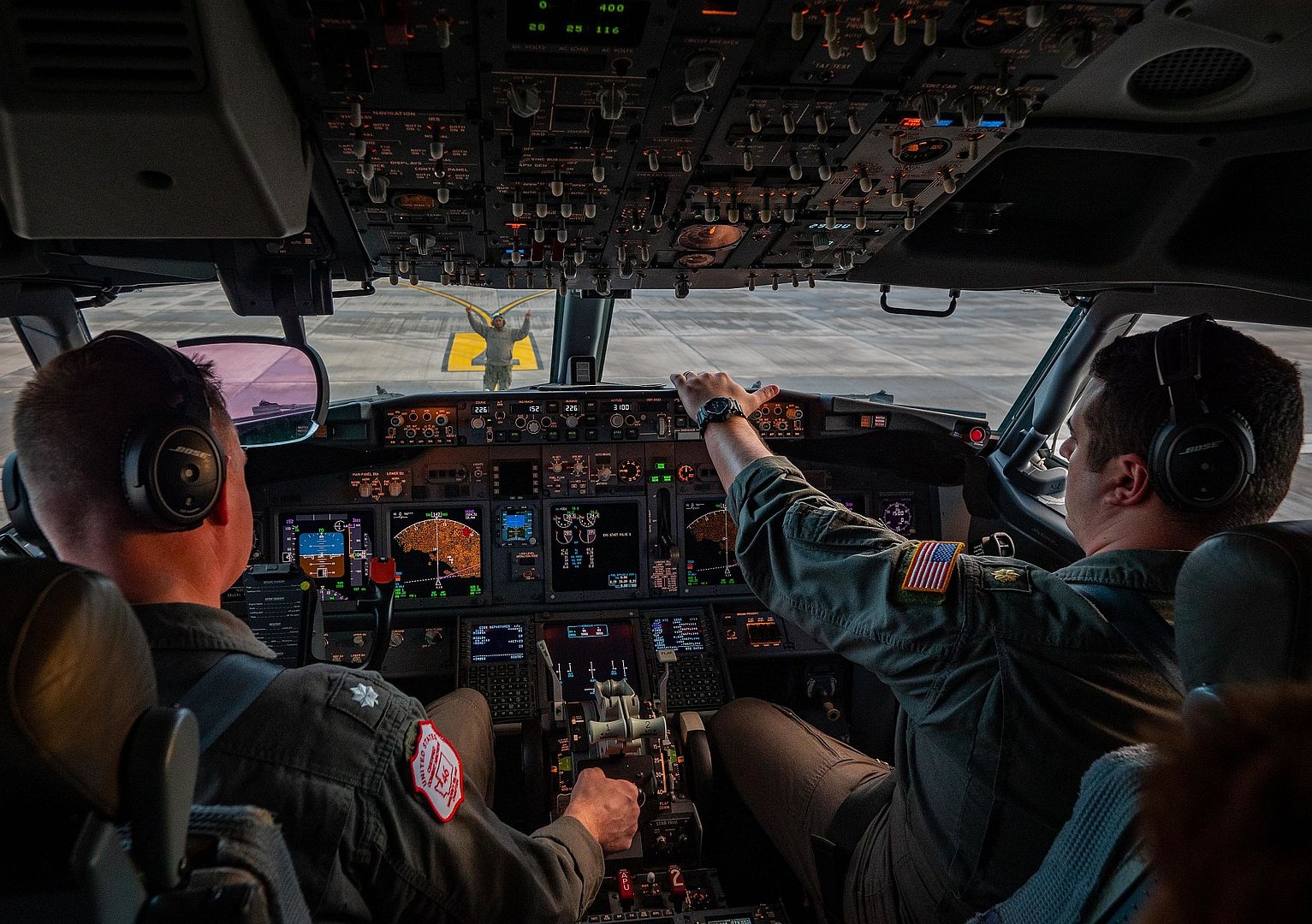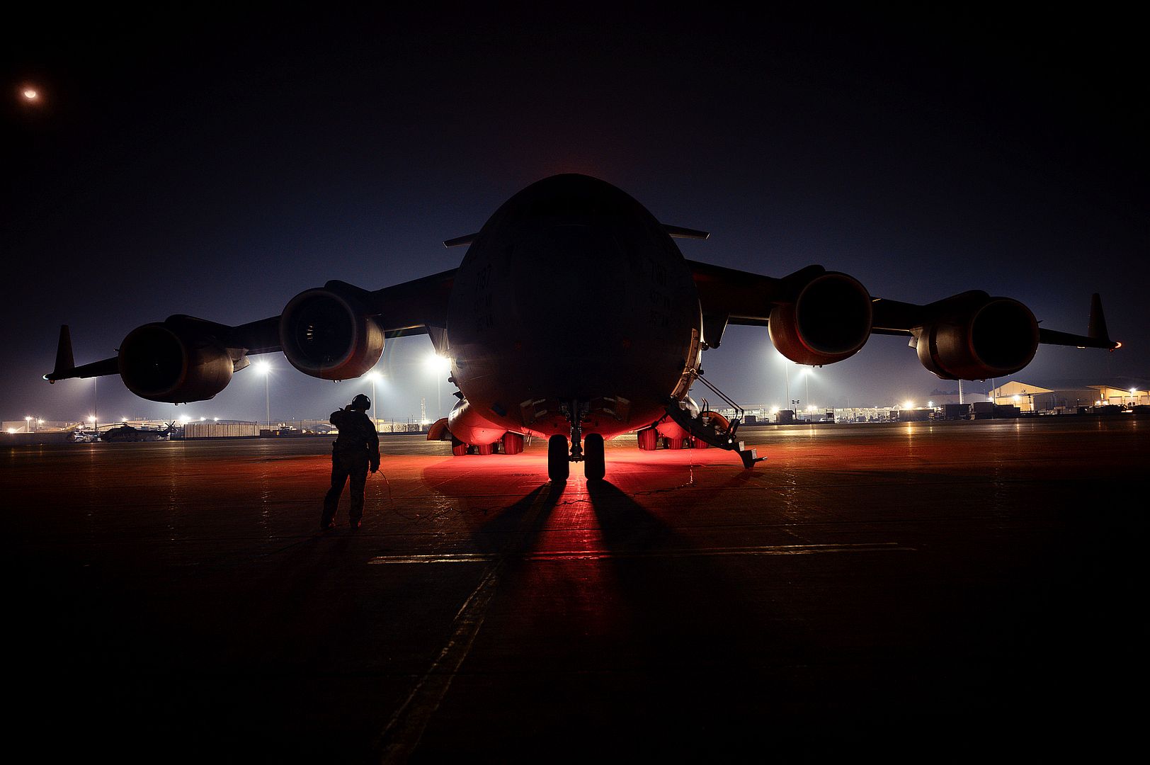 A U.S. Air Force C-17 Globemaster III loadmaster assigned to the 816th Expeditionary Airlift Squadron, completes preflight checks during a mission in Southwest Asia, Dec. 25, 2020. The 816th EAS, deployed with U.S. Air Forces Central, is responsible for delivering cargo and passengers to U.S. and coalition forces' bases, throughout the U.S. Central Command area of responsibility. (U.S. Air Force photo by Master Sgt. Joey Swafford)