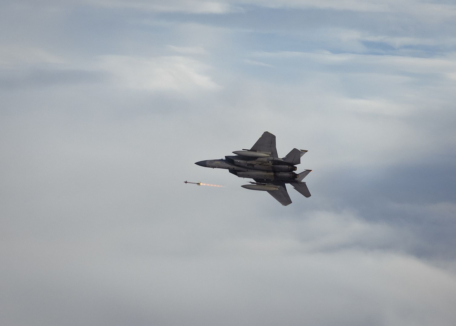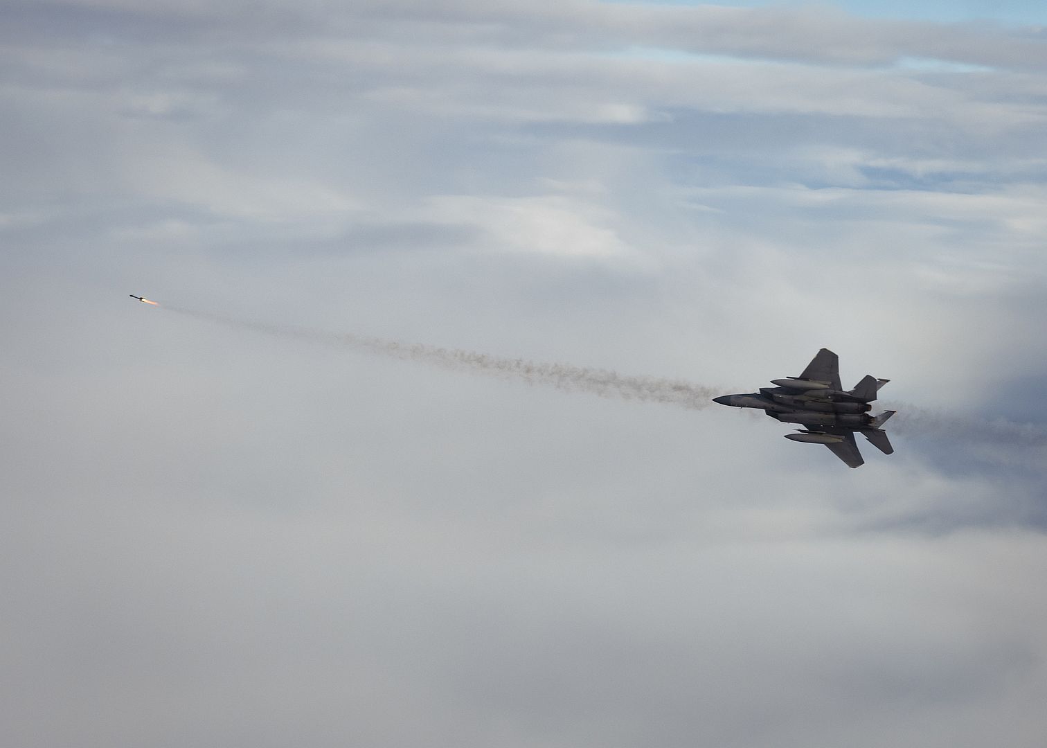 A U.S. Air Force F-15C Eagle assigned to the 493rd Fighter Squadron fires a special air training missile, NATM-9M, during a training exercise over the Atlantic Ocean, Dec. 8, 2020. The training followed a specific set of range procedures employing the munition against a drone to test and ensure combat readiness of aircrew and aircraft. (U.S. Air Force photos by Staff Sgt. Rachel Maxwell)
