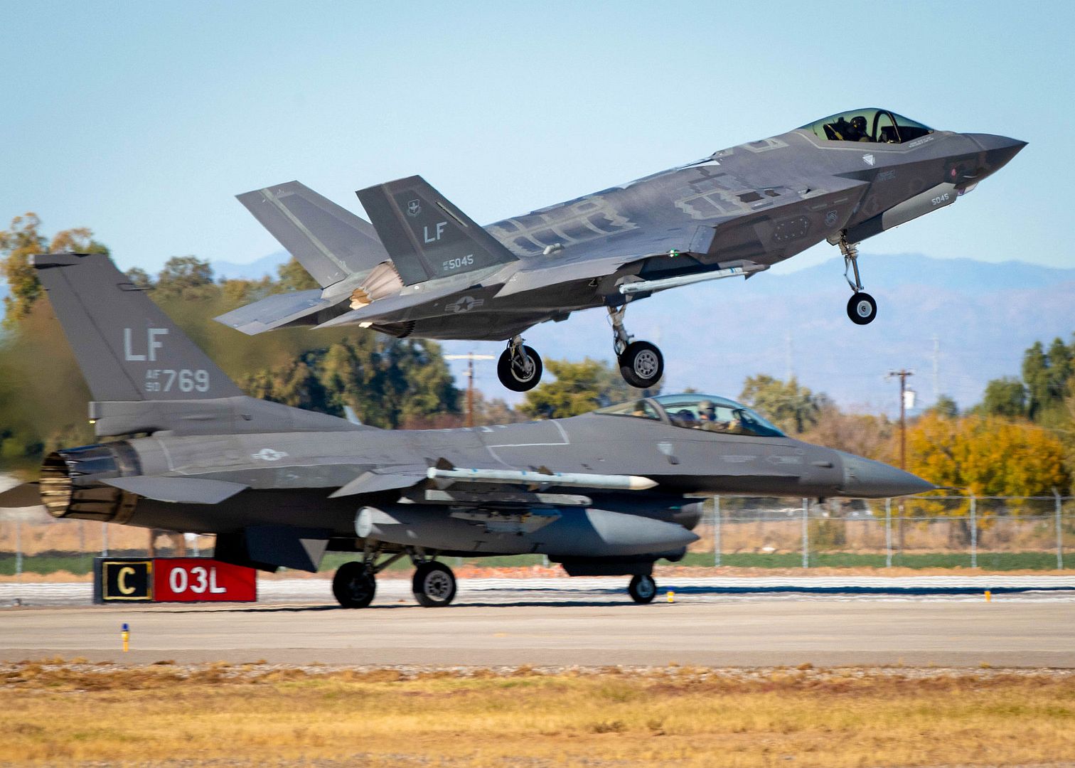 An F-35A Lightning II lands while an F-16 Fighting Falcon prepares for takeoff, Dec. 15, 2020, at Luke Air Force Base, Arizona. Luke AFB?s mission is to train F-16 and F-35 fighter pilots and has graduated more than 61,000 fighter pilots since 1941. There are four F-35 fighter squadrons and four F-16 fighter squadrons that directly support the base?s mission of training the world?s greatest fighter pilots. (U.S. Air Force photo by Airman 1st Class Brooke Moeder)