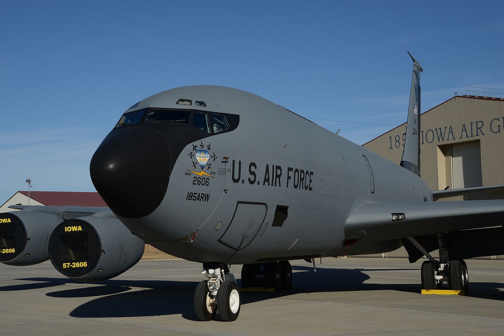 A U.S. Air Force KC-135 assigned to the Iowa Air National Guard?s 185th Air Refueling Wing in Sioux City, Iowa is painted with a diamond on the nose as part of a 75th anniversary paint scheme. The diamond is surrounded by silhouettes depicting each aircraft flown by the unit since its beginnings in 1946. A thunderbolt is included along with the diamond as an homage to aircraft flown during the 1950?s like the F-84 Thunderjet.