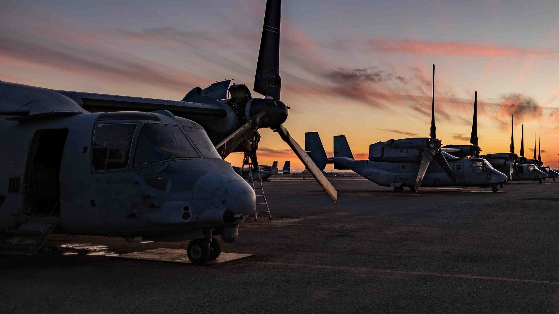 U.S. Marines with Marine Medium Tiltrotor Squadron 362, assigned to Special Purpose Marine Air-Ground Task Force - Crisis Response - Central Command, perform routine maintenance on an MV-22 Osprey at dusk in Kuwait, Dec. 12, 2020. Marines and Sailors conduct maintenance 24-hours per day to ensure the Aviation Combat Element is ready to fly at a moment?s notice. The SPMAGTF-CR-CC is a crisis response force, prepared to deploy a variety of capabilities across the region. (U.S. Marine Corps photo by Cpl. Robert Kuehn)